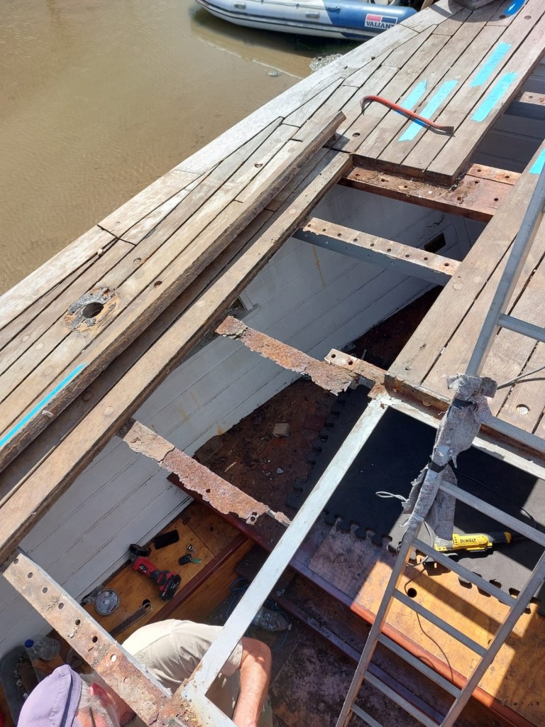 The plan…. the teak has been removed from the deck, alongside all the deck fittings. This has revealed some “somewhat Lacey” deck beams that want replacing and some rather ropey teak. The course of action is to add in the new deck beams but with more of a camber to the deck – this is how it would have been originally and allows the water to more readily run off the deck, hopefully avoiding it all rolling towards the windows and making that soggy. Then we are having a new marine ply sub deck, on top of that will be much thinner planks of iroko/teak (probably about an inch) which will be glued down the the subdeck.