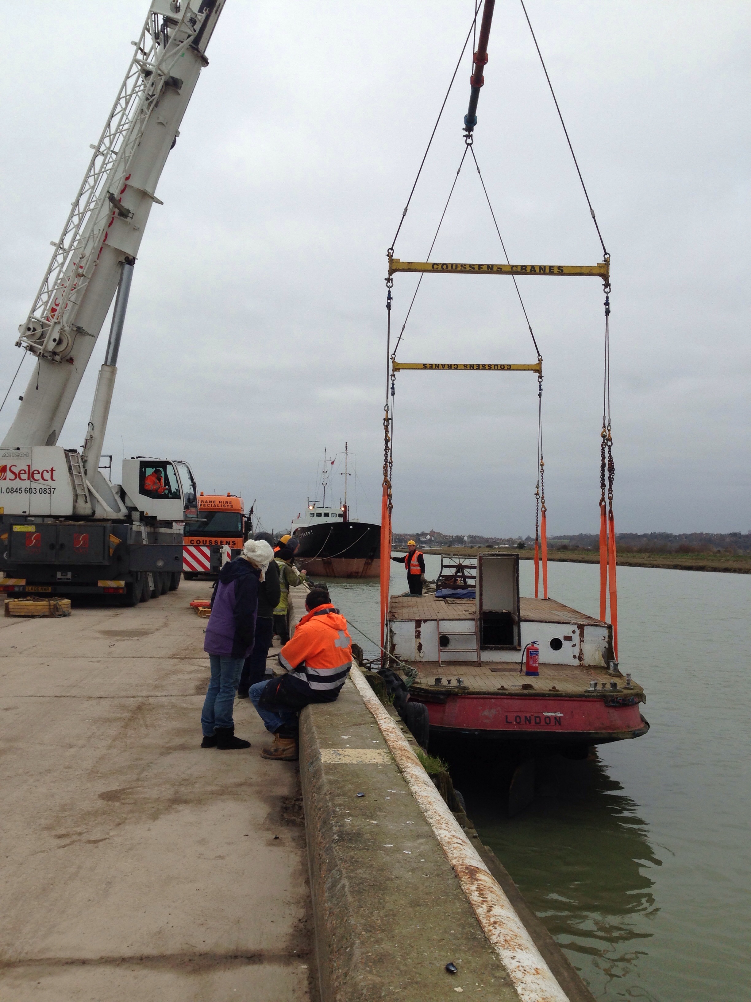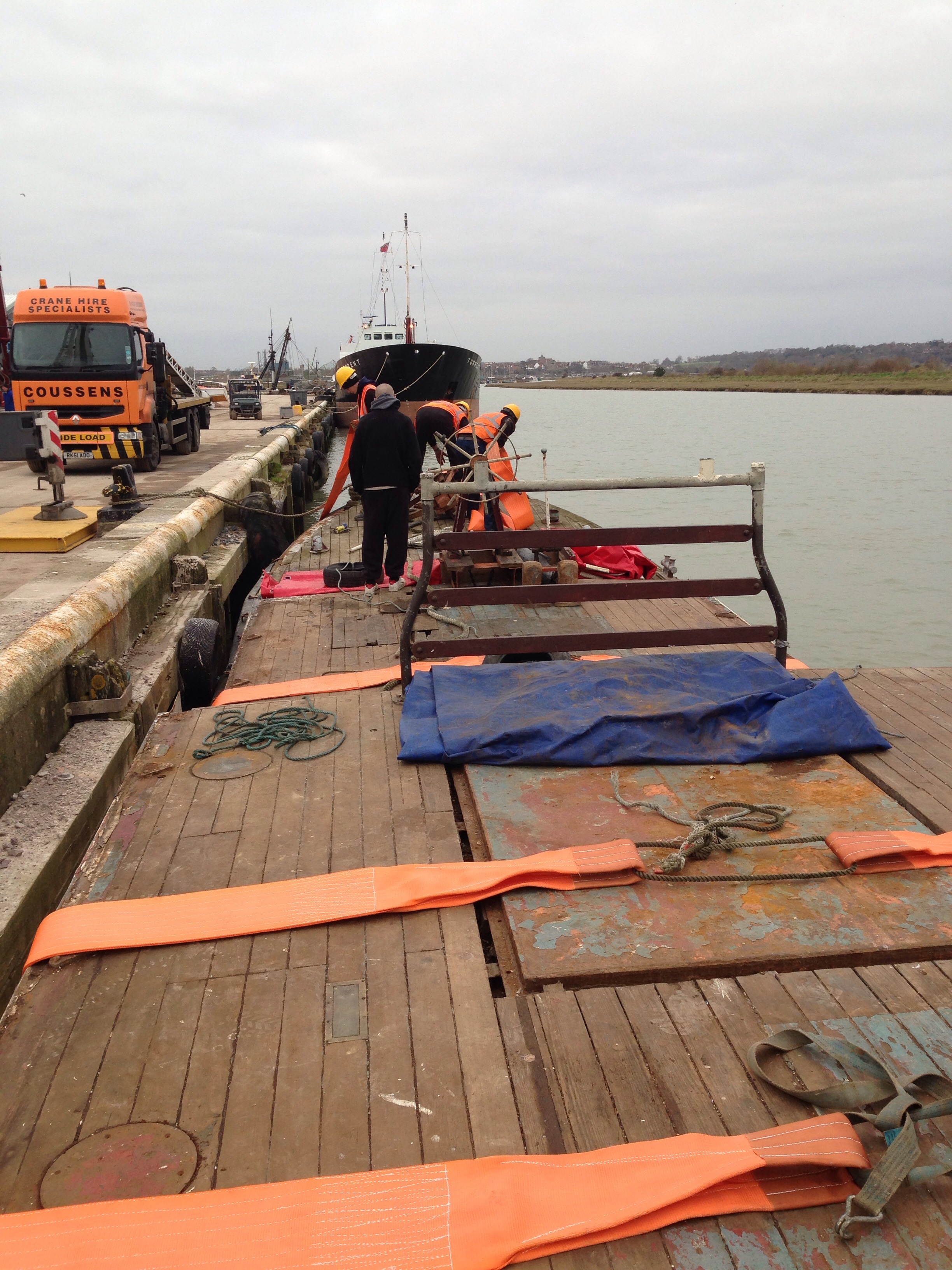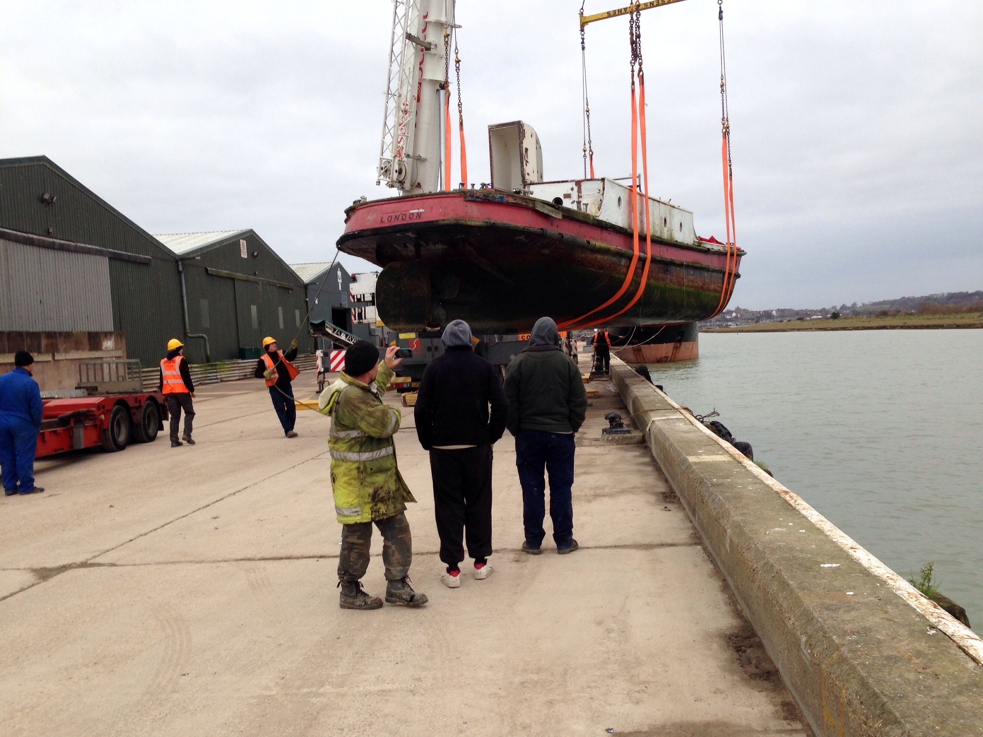 And we were off… If you remember from previous posts, one of the big unknowns was how much the boat weighed. Based on the stamp on the hull and other guestimates, it had been suggested it would be around 28 tonnes. The crane has a lifting limit and was crucial that she wasn’t too heavy. If the alarm on the crane started beeping, she would be too heavy to lift. And you can guess, the alarm started beeping. A whopping 35 tonnes (plus the weight of the chandelier thingy).