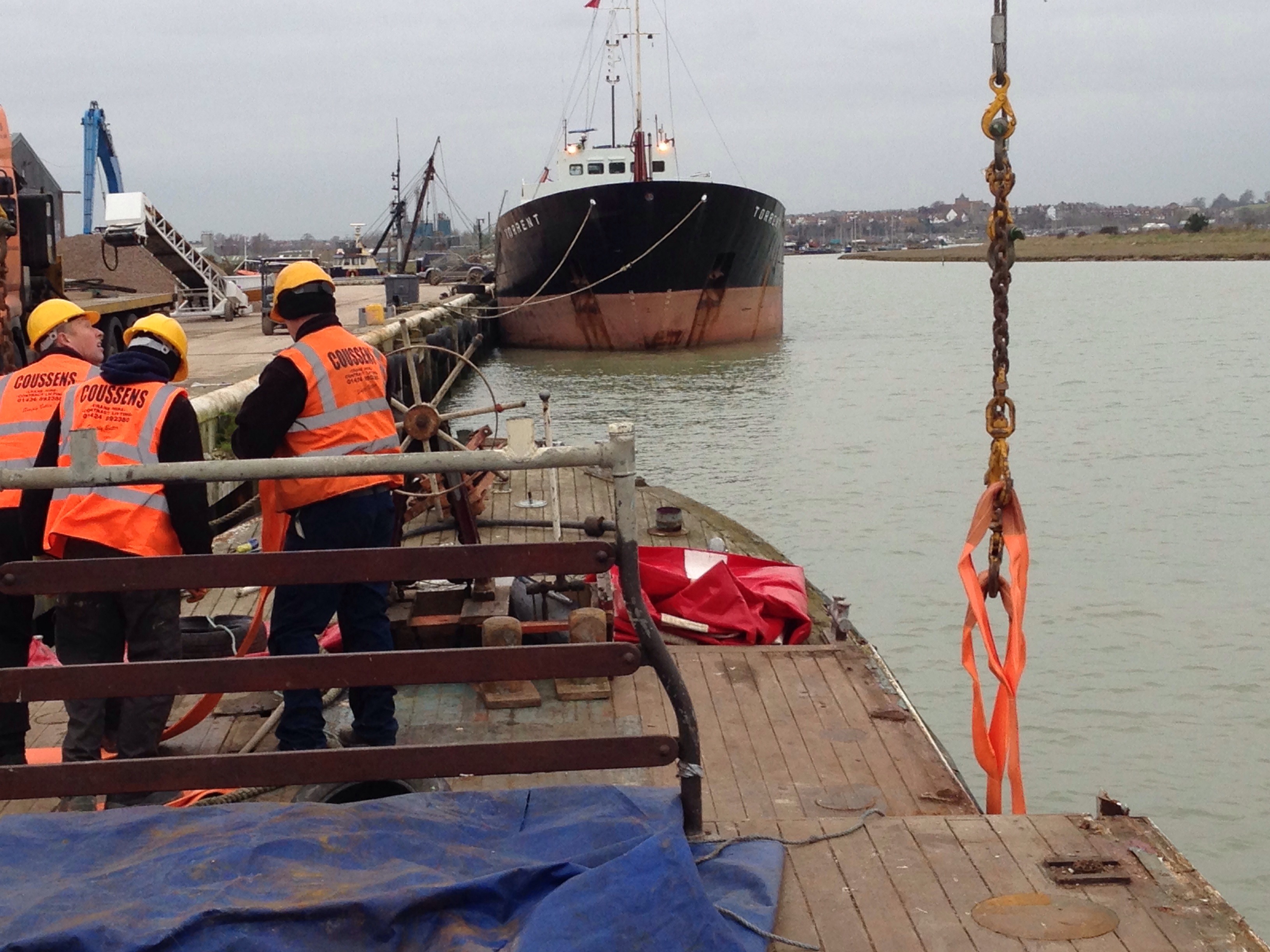 The first job was getting the strops (the big orange straps) underneath the boat. These where then attached to the lifting device – a chandelier that helps hold the strops apart preventing the weight pulling them all together and putting pressure on the hull.