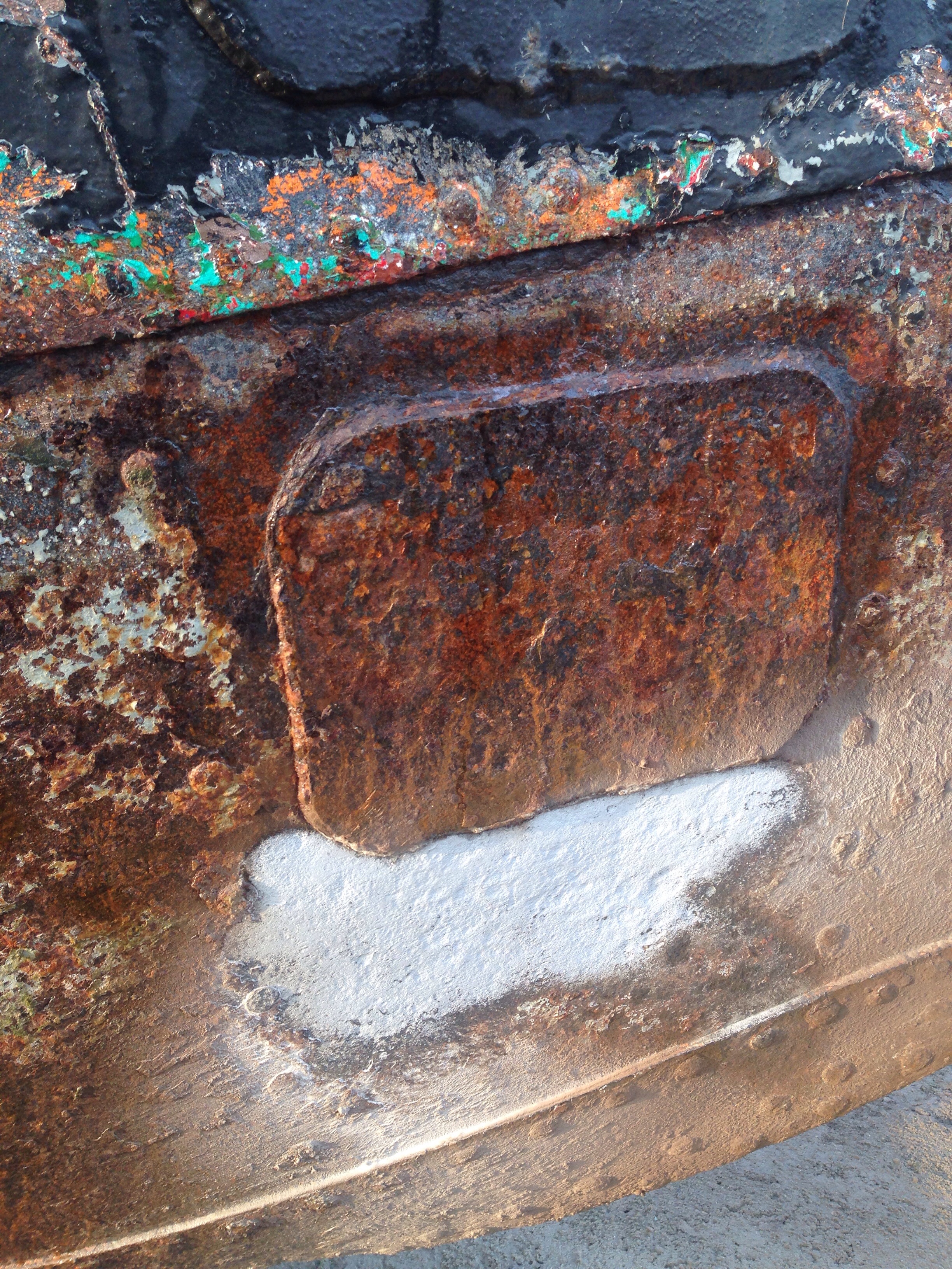 4- the surface revealed is dullish grey like zinc and needs to be covered immediately in shop primer (more on that world of hell later) to stop it re-rusting.