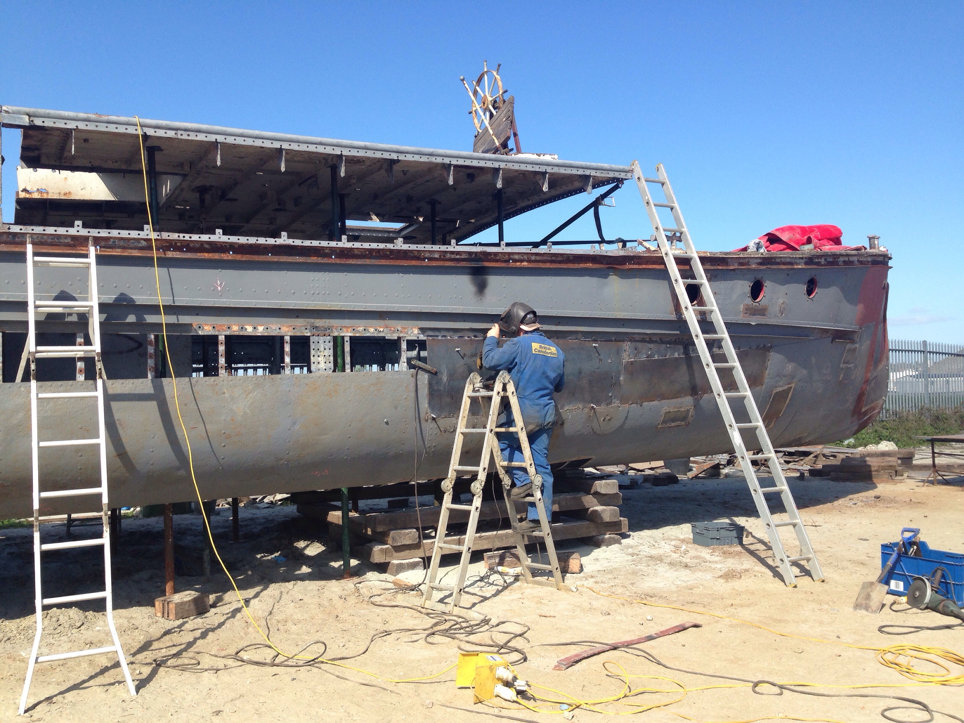 I had speculated that the deck must have been lowered in one piece as the wood is largely intact. Toby and Alex examined the joins and suggested that they would be able to put it back up after a bit of cutting and through the power of air jacks. What comes down must go back up right????