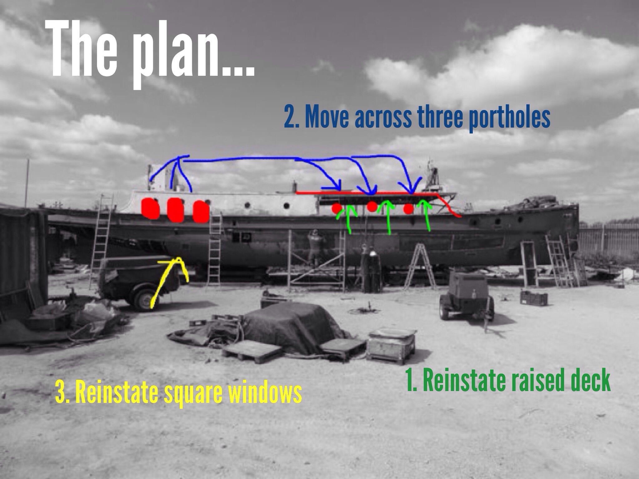 Part of the plan was always to try and lift part if the deck and reinstate it to its previous position. This would give more headroom in the lower cabin and restore the original shape.