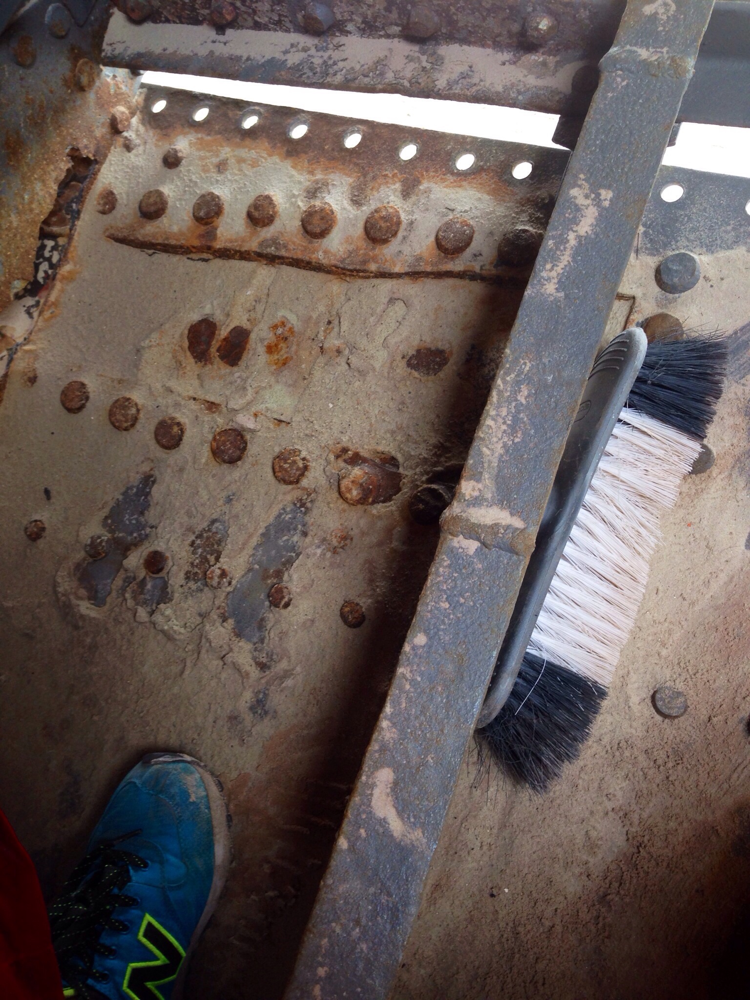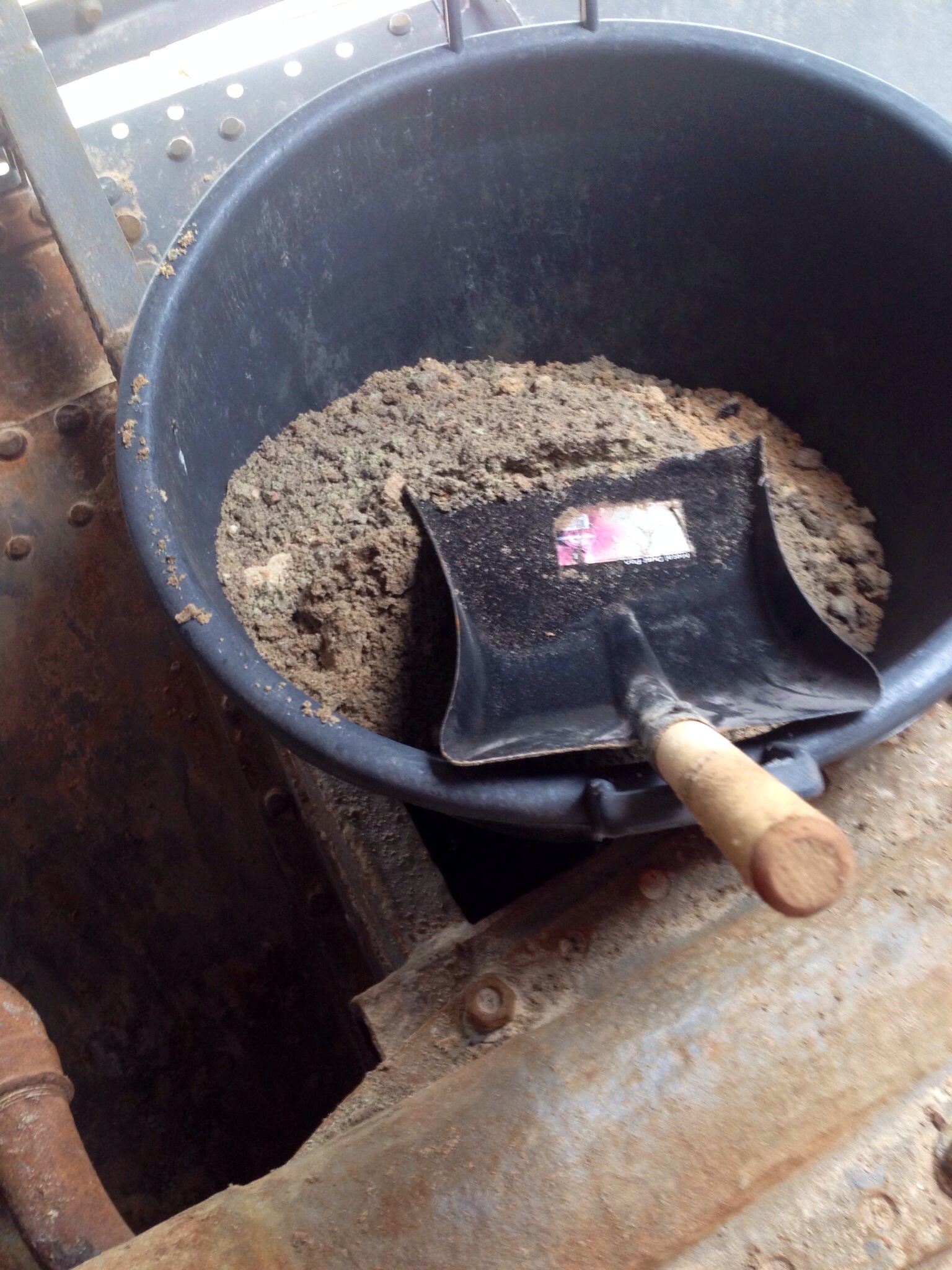 Remember the previous post where I was scraping diesel sludge out of the bottom of the boat? Well, that was only part of the story…. First the sludge was shovelled… Then it was scabbled and that debris was removed… Then it was blasted and that debris was shovelled out… Now the underside of the decks have been blasted and the aware blast material needs to be removed. Hopefully this is the last stage of shit shovelling.