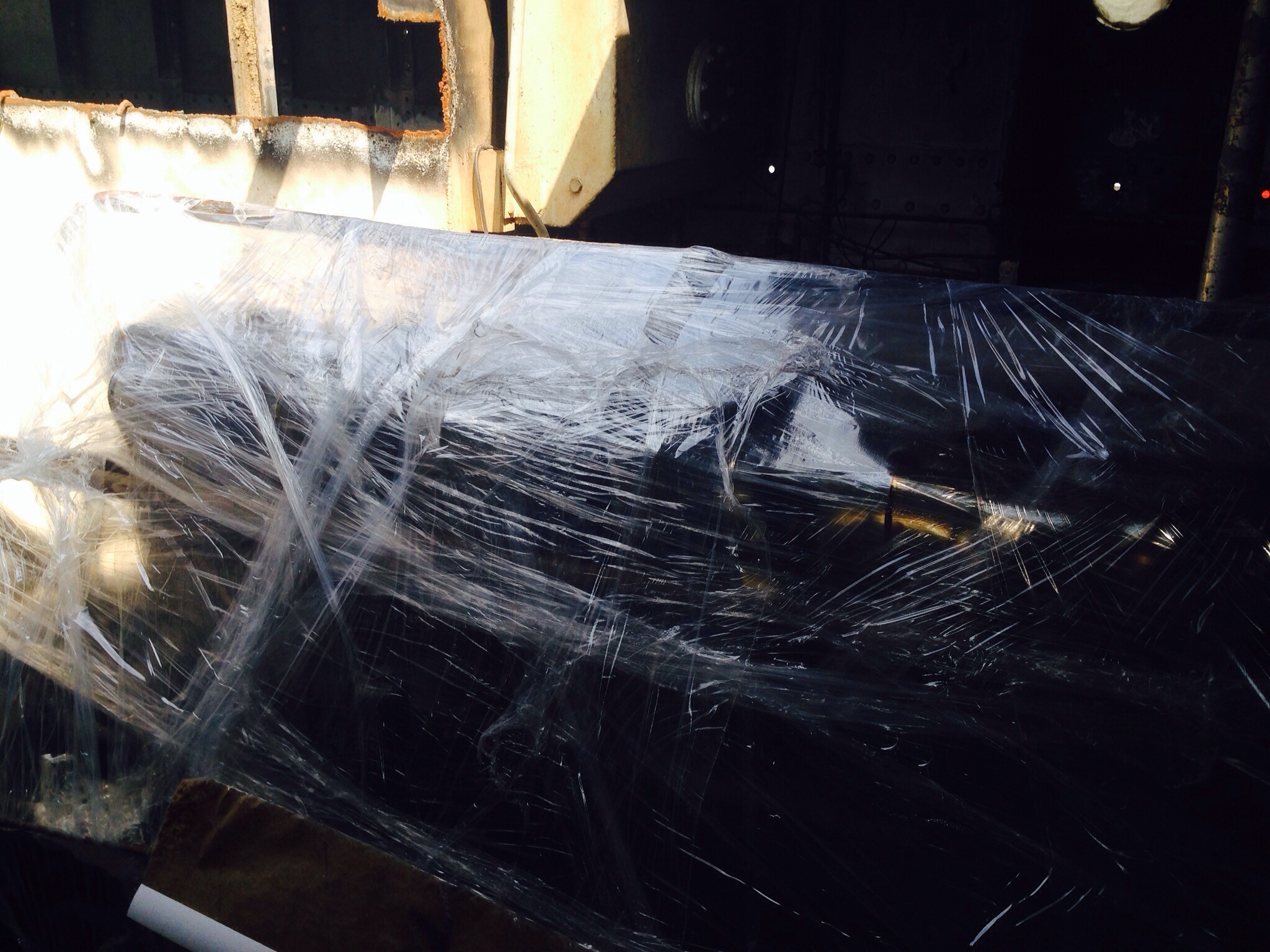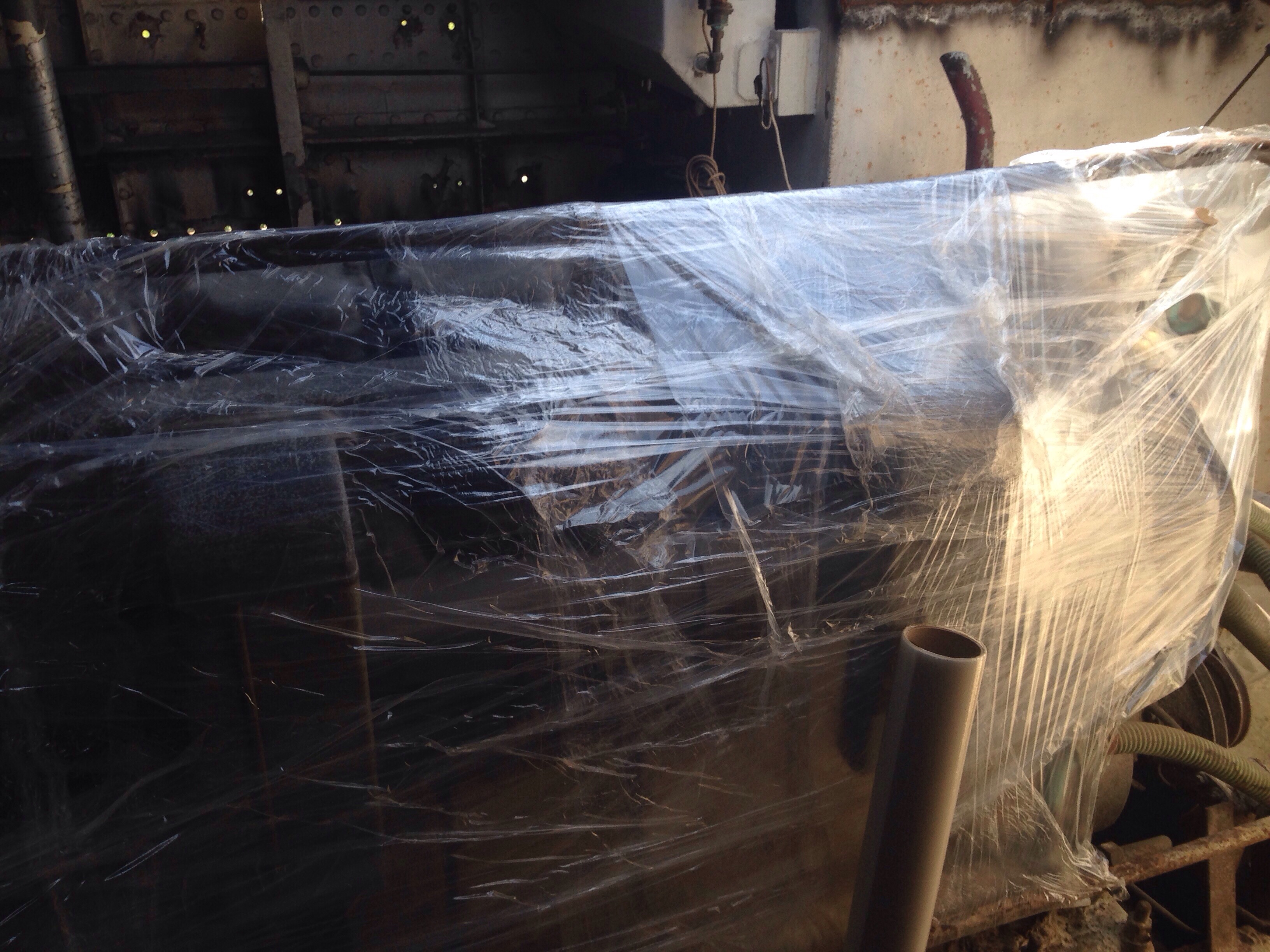 The engine needs some sort of protection while the engine room is blasted. Martyn from MPS taped up the air vents for me. The rest of the engine is now covered in a layer of that heavy duty cling film builders use to protect carpet.