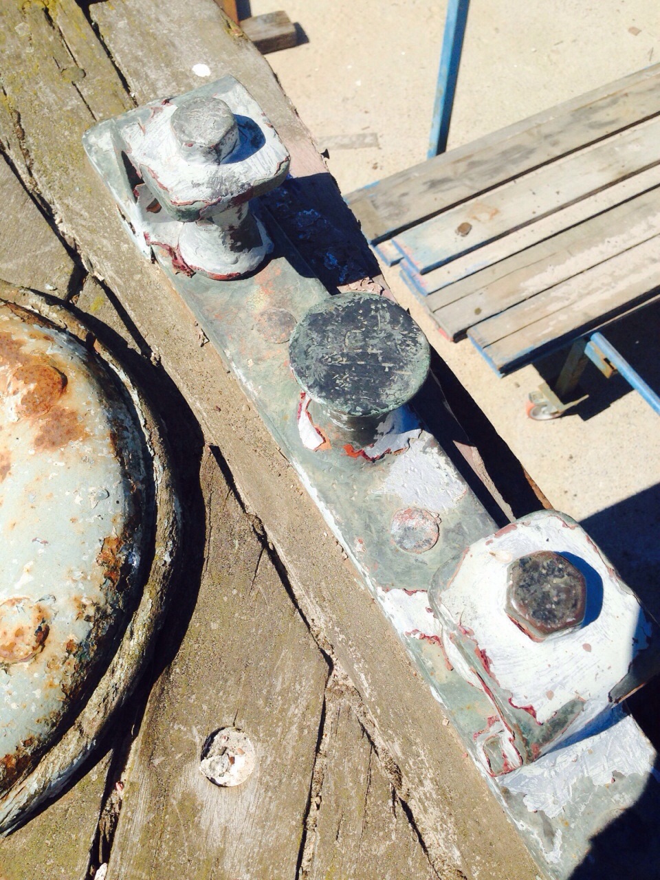 “This type of square post with pins through is known as a “Bollard” , the pins you tie to, or if you have the eye of a rope dropped over it and the rope tied off ashore, the pins stop the rope popping up and coming off”