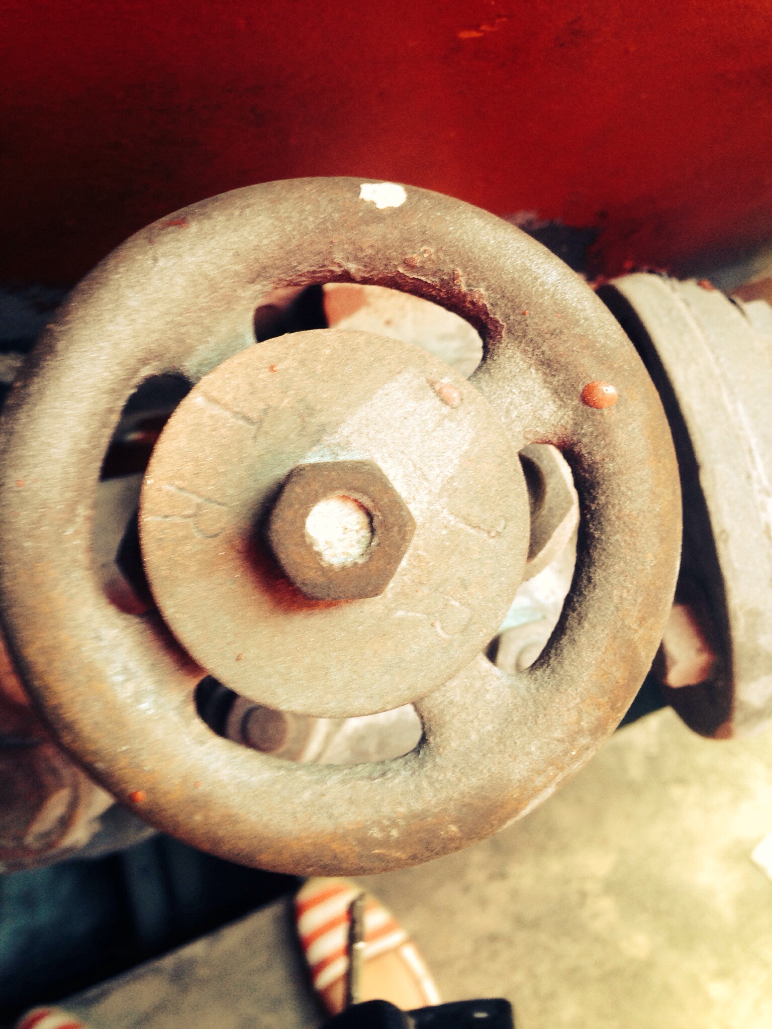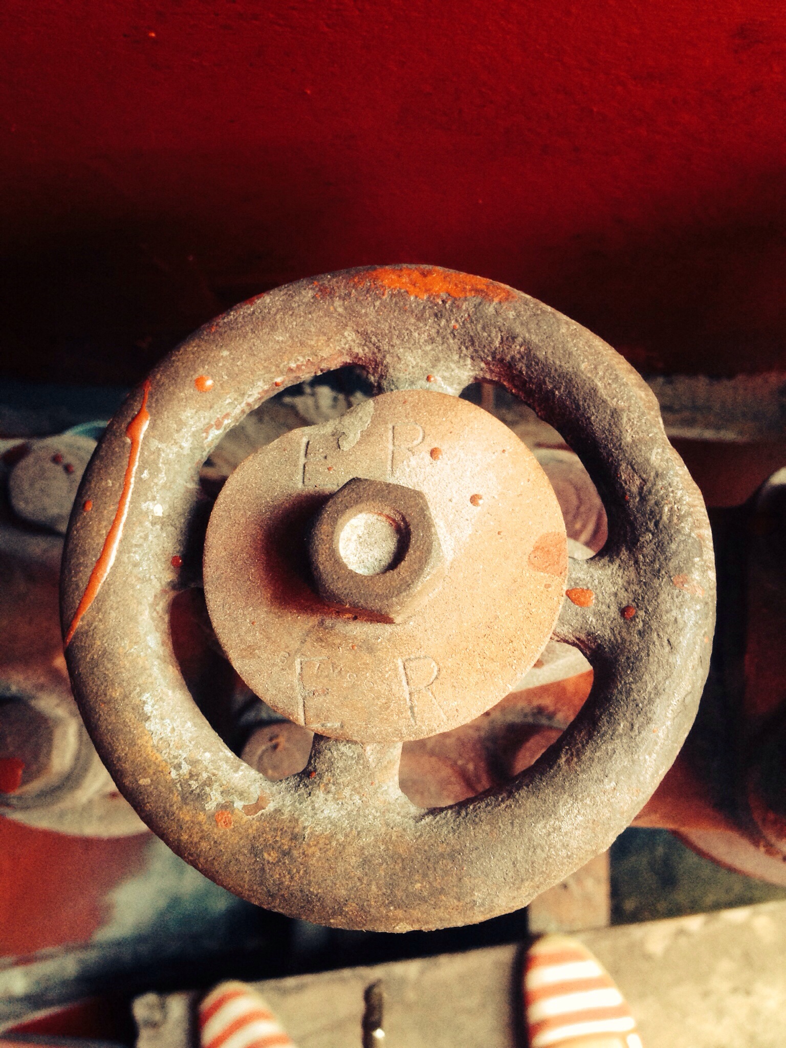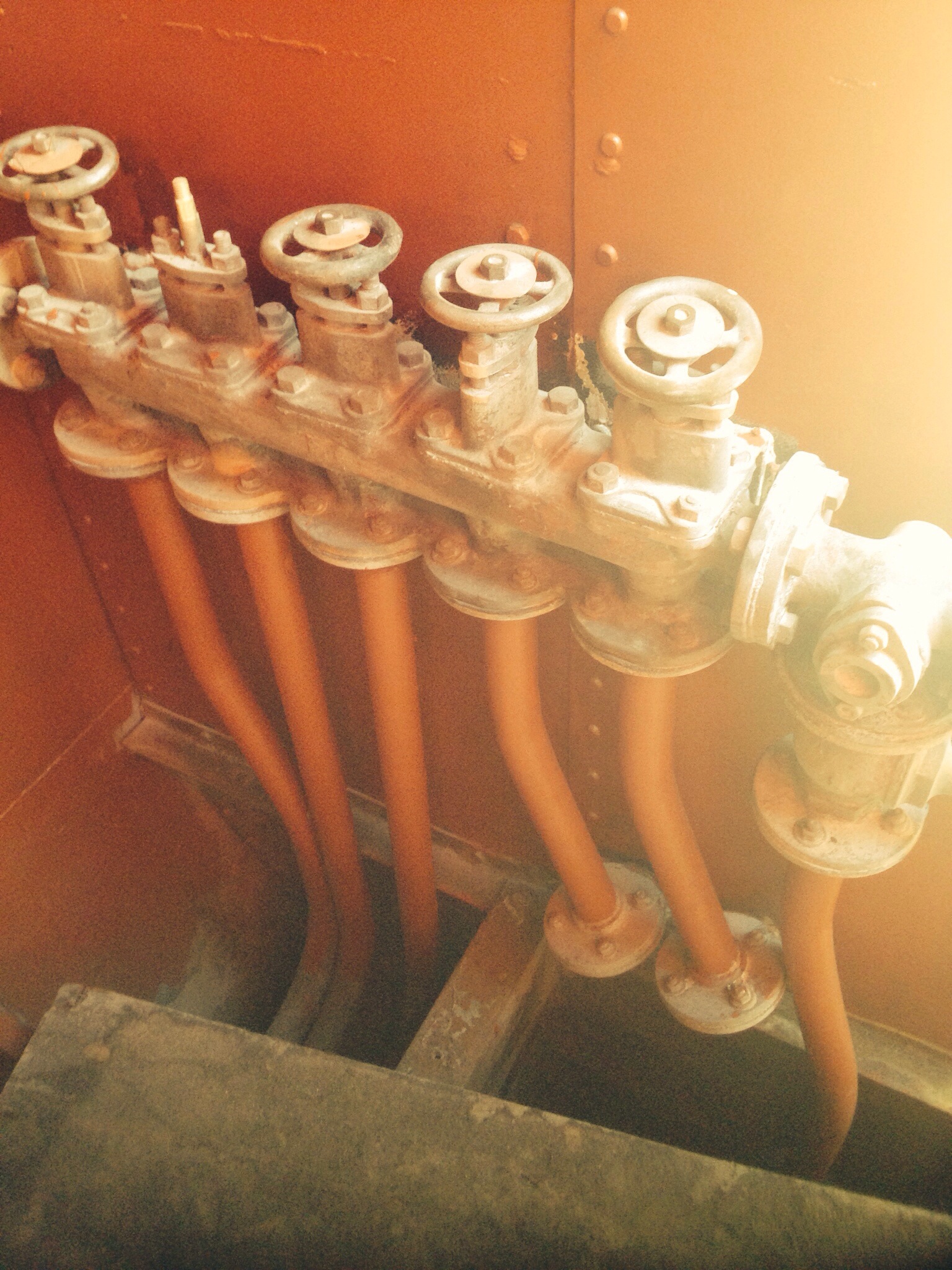 Takes me back to proper old ships. The bronze bilge valve manifold was very common and a very elegant way of sucking the bilges out from different compartments. The pipe on the right of the pic with the sight glass should go to the bilge pump suction and by opening the relevant valve wheel to the space concerned will suck out the bilge contents. The missing valve wheel probably had AP =Aft Peak stamped on it.