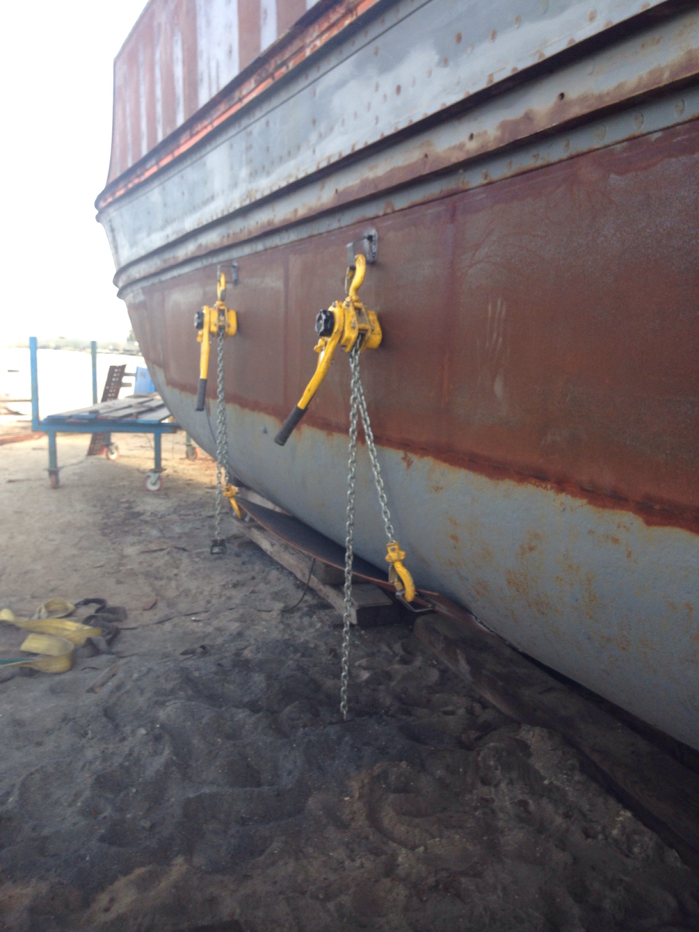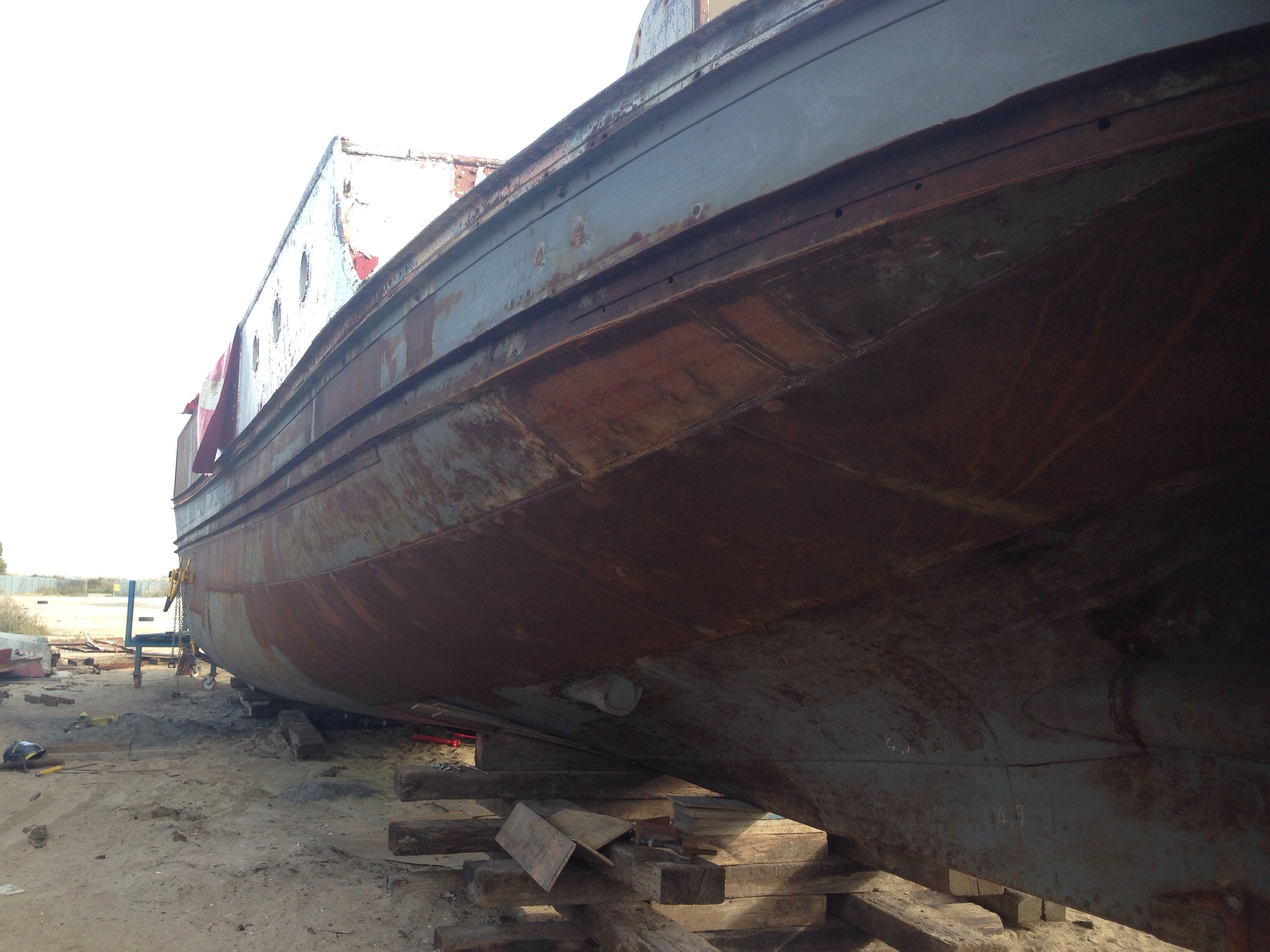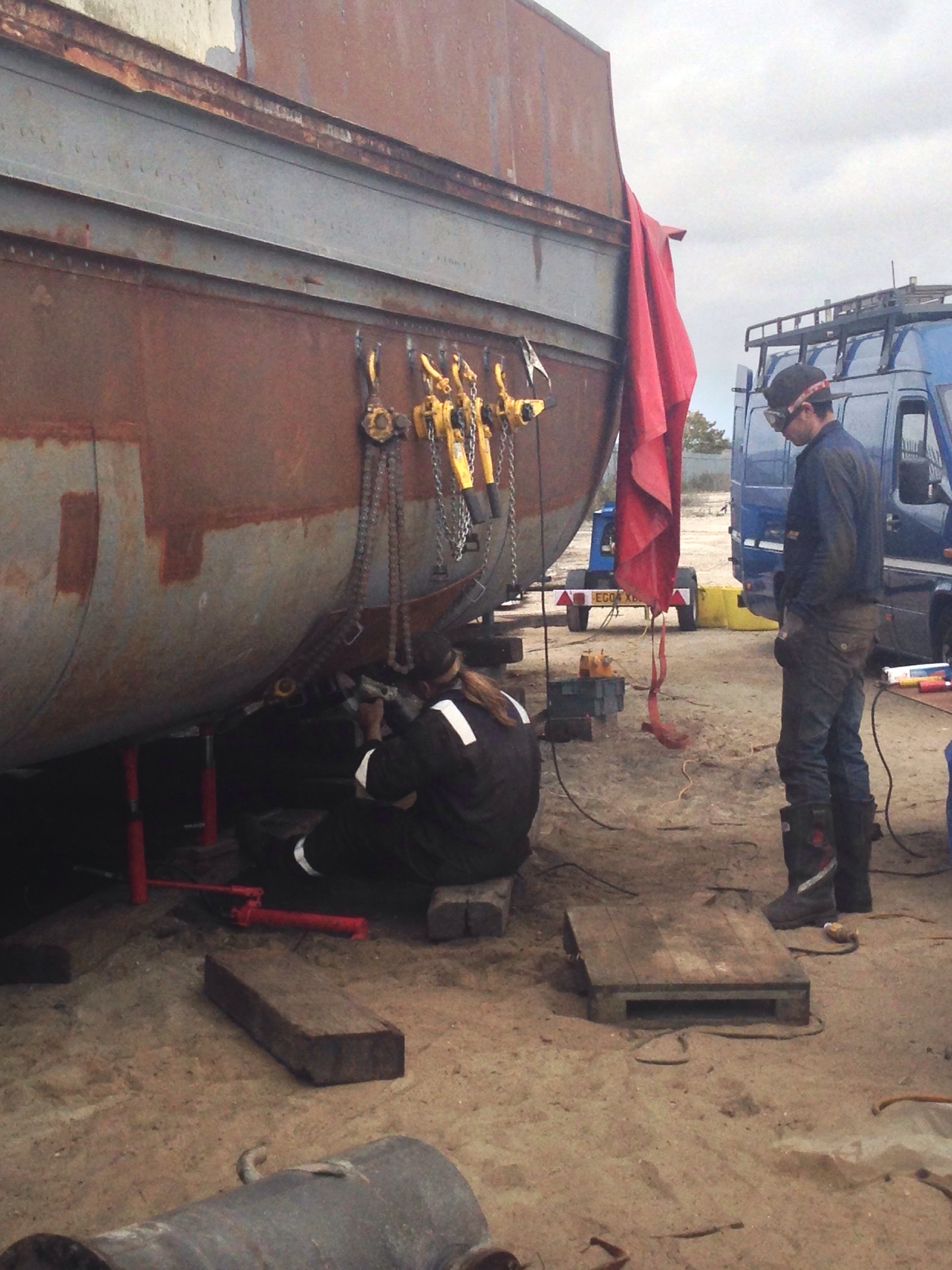 The bow is all fixed, the striker rails repaired, the rivets on the bottom fixed, the patches welded, the stern plates completed. So today four chaps were on site to attach the bottom plates. Not quite the final piece of the puzzle but without a bottom it look far from sea worthy.