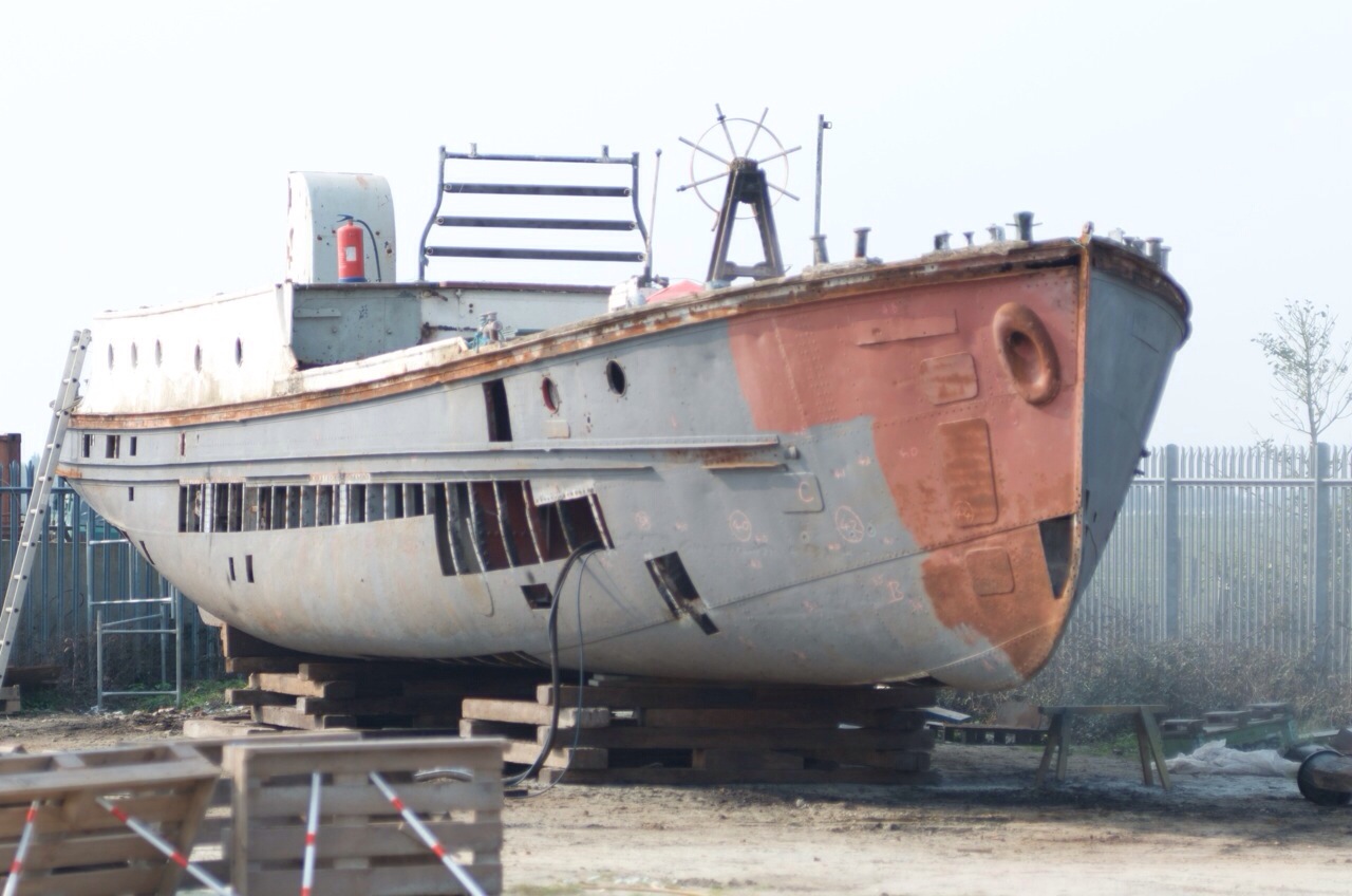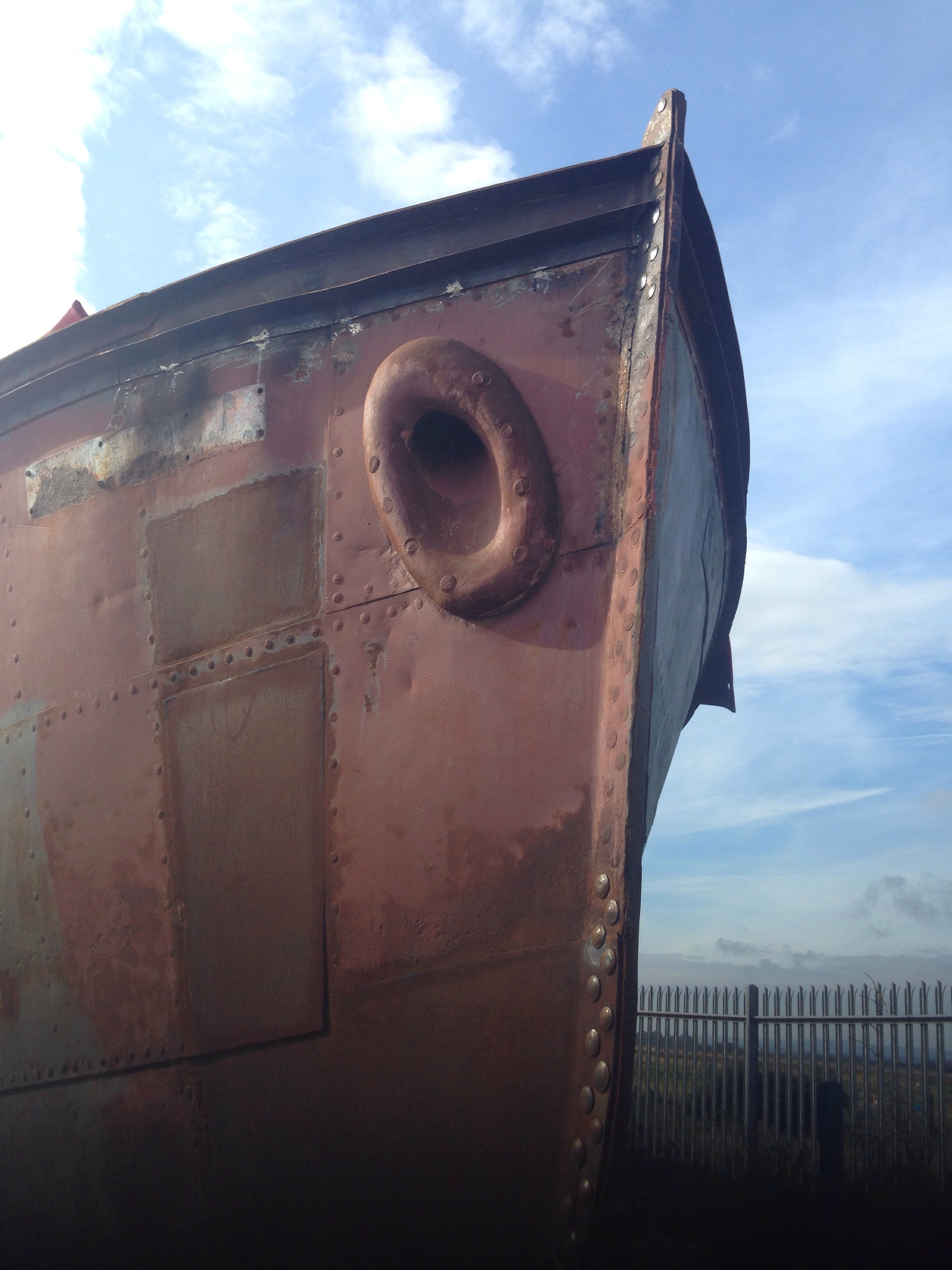 Way way back in April, I posted an initial picture of the work on the bow. The photos, reposted below, show the rotten bits right at the bow cut away and the start of the repairs.