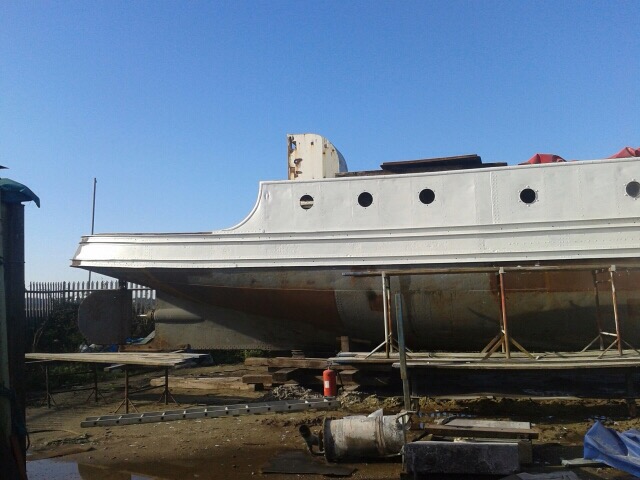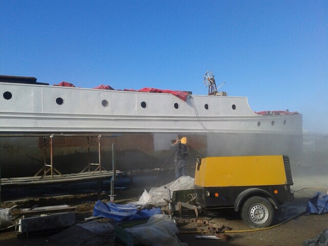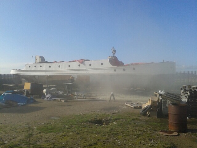 We have paint on the boat!!!! Two layers in fact!!! – the aluminium undercoat and the first white base layer!!!