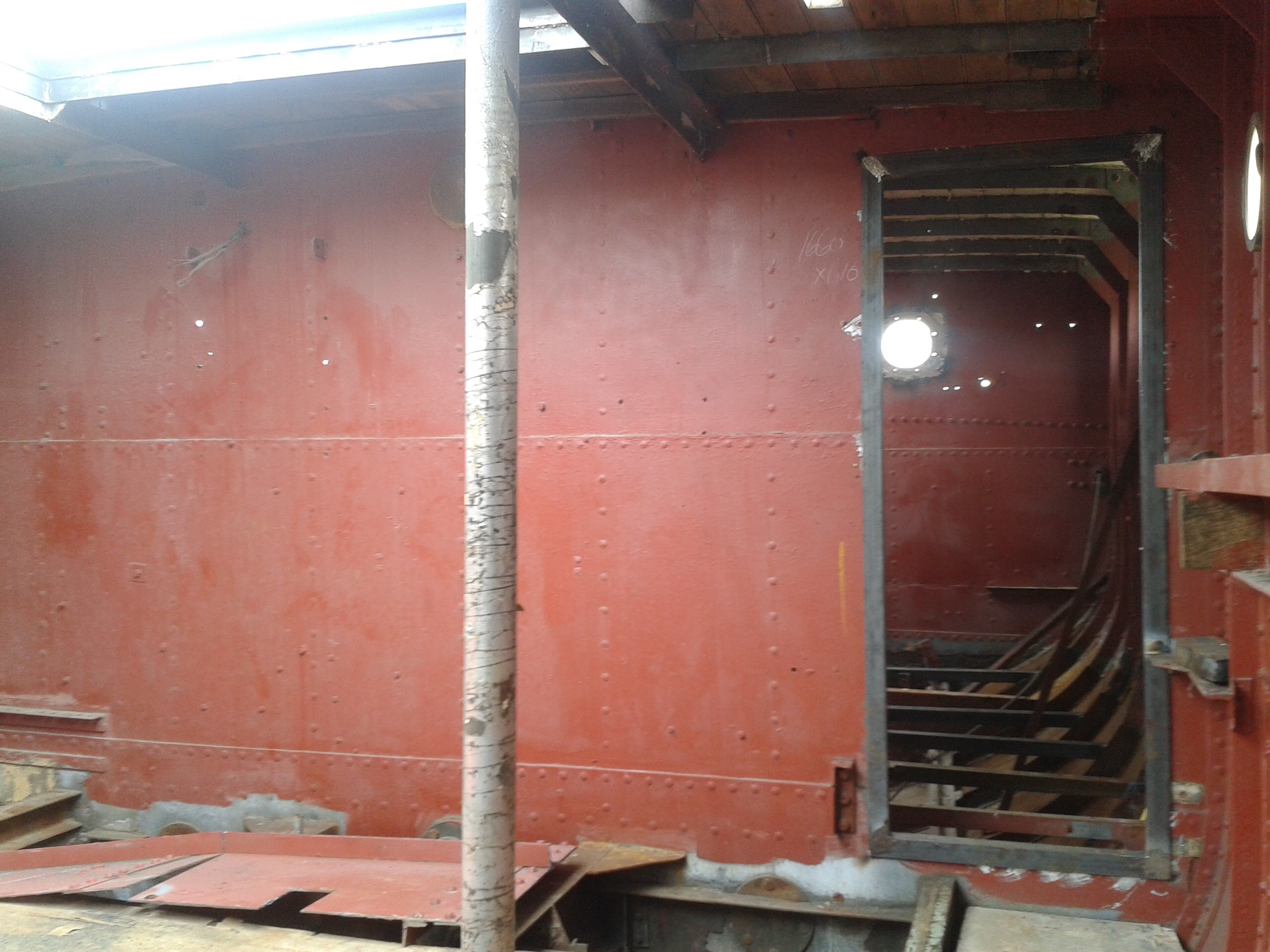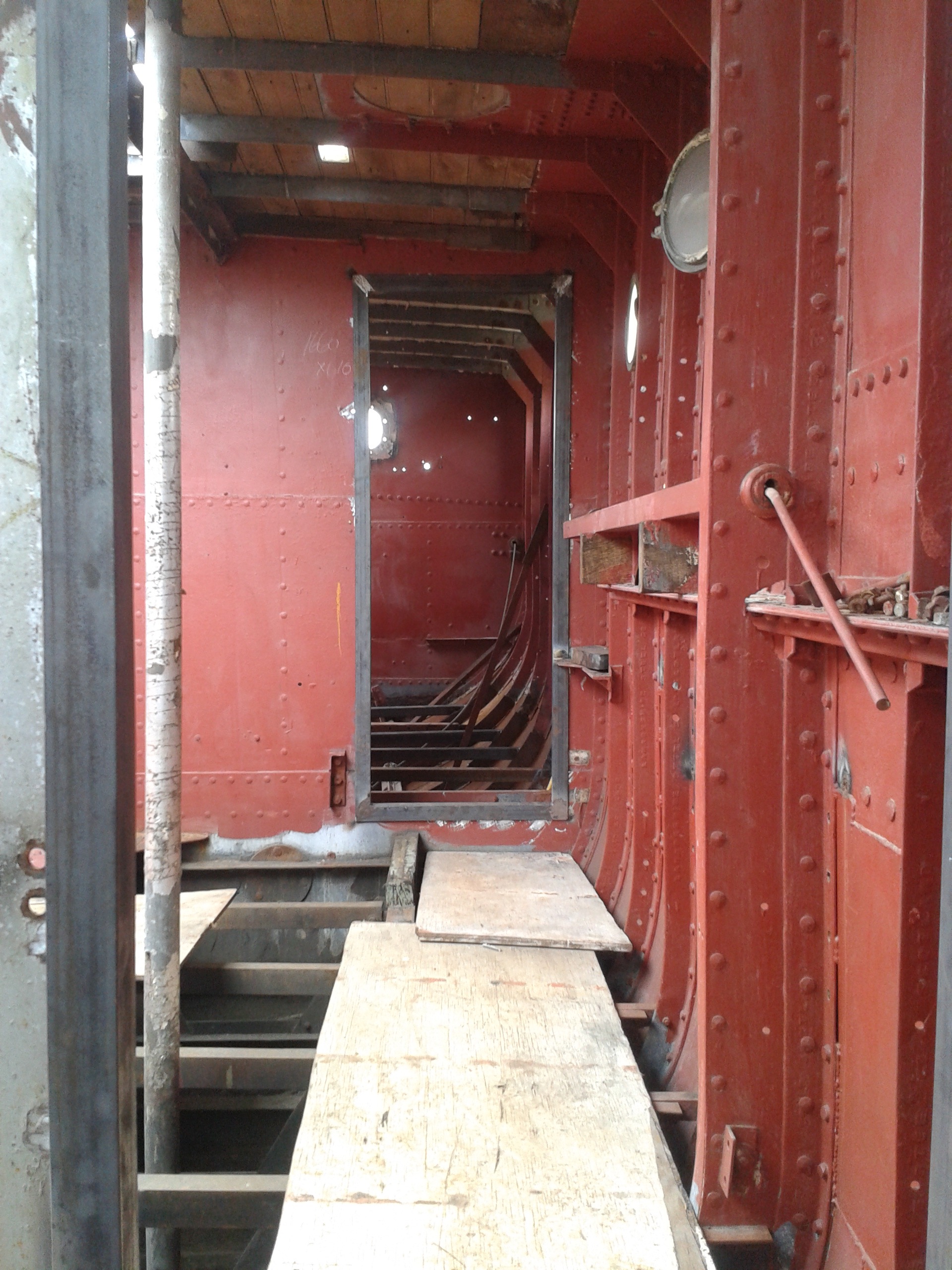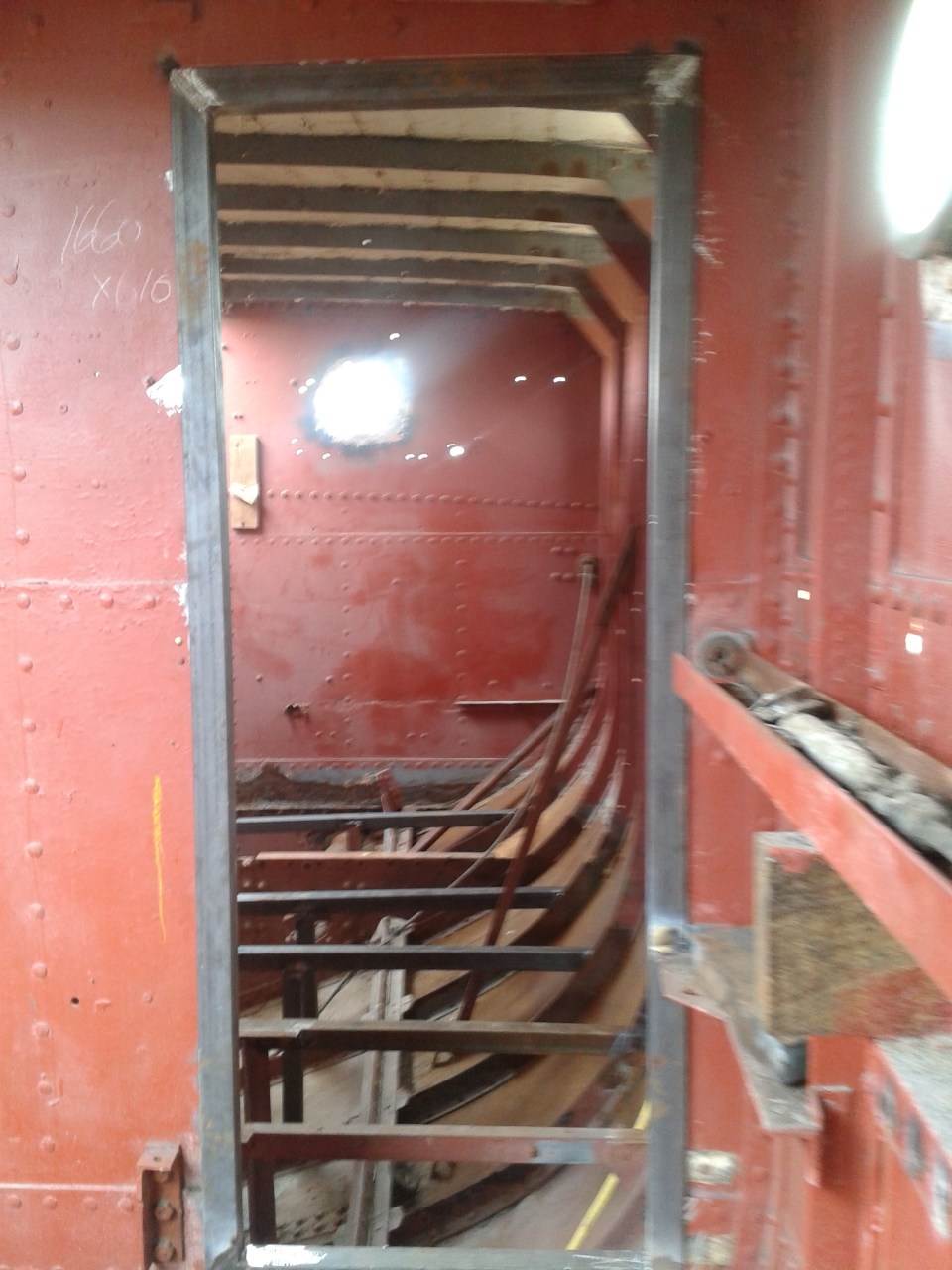 Literally. But this time the welders haven’t been welding but rather cutting away. Specifically through from the rear cabin into the engine room, the engine room to the main cabin, and the main cabin to the front cabin. The new openings have been framed like doorways and the space is really starting to make sense.