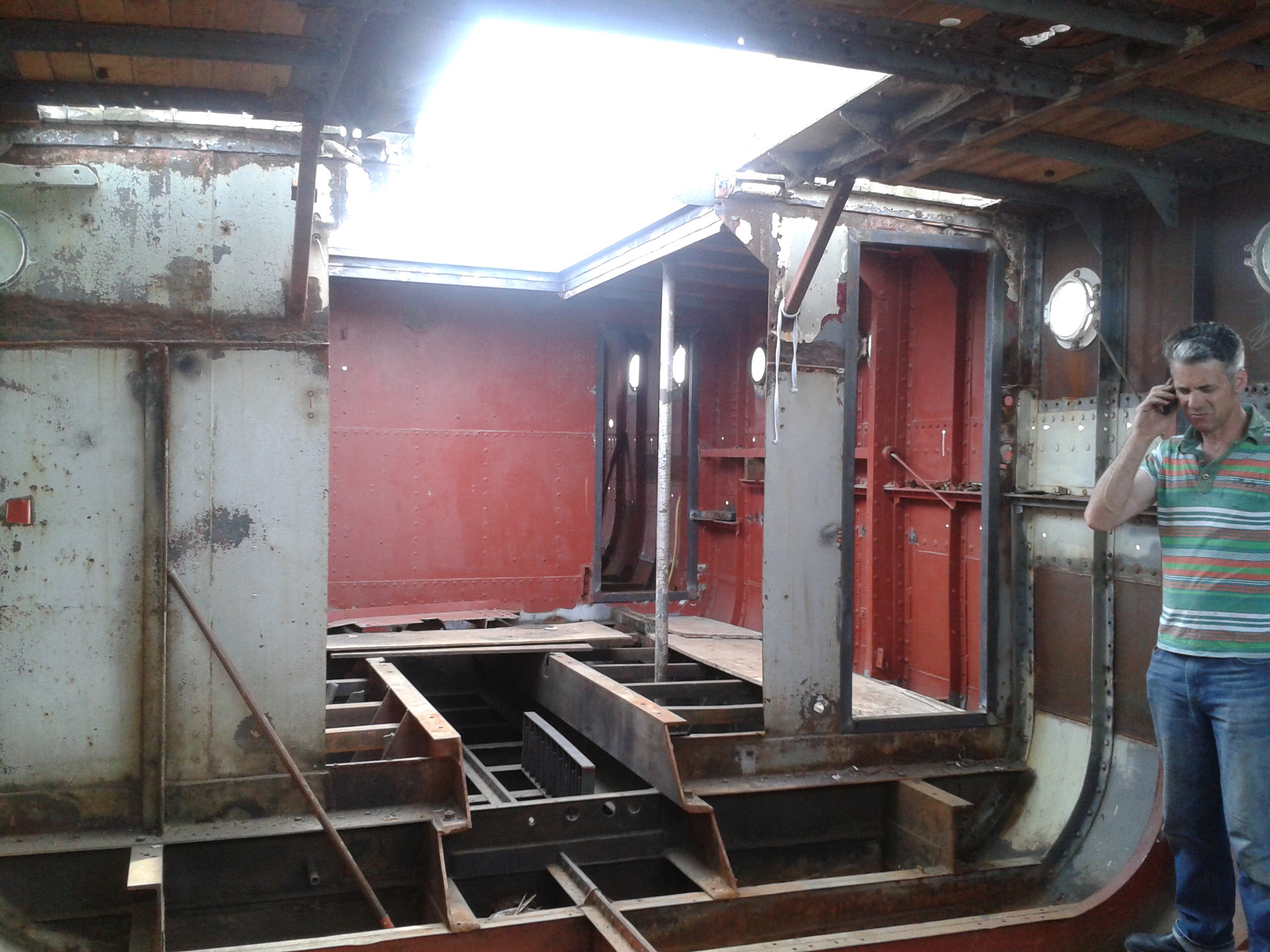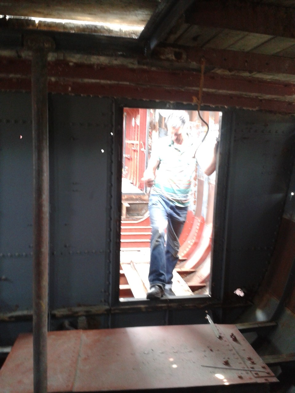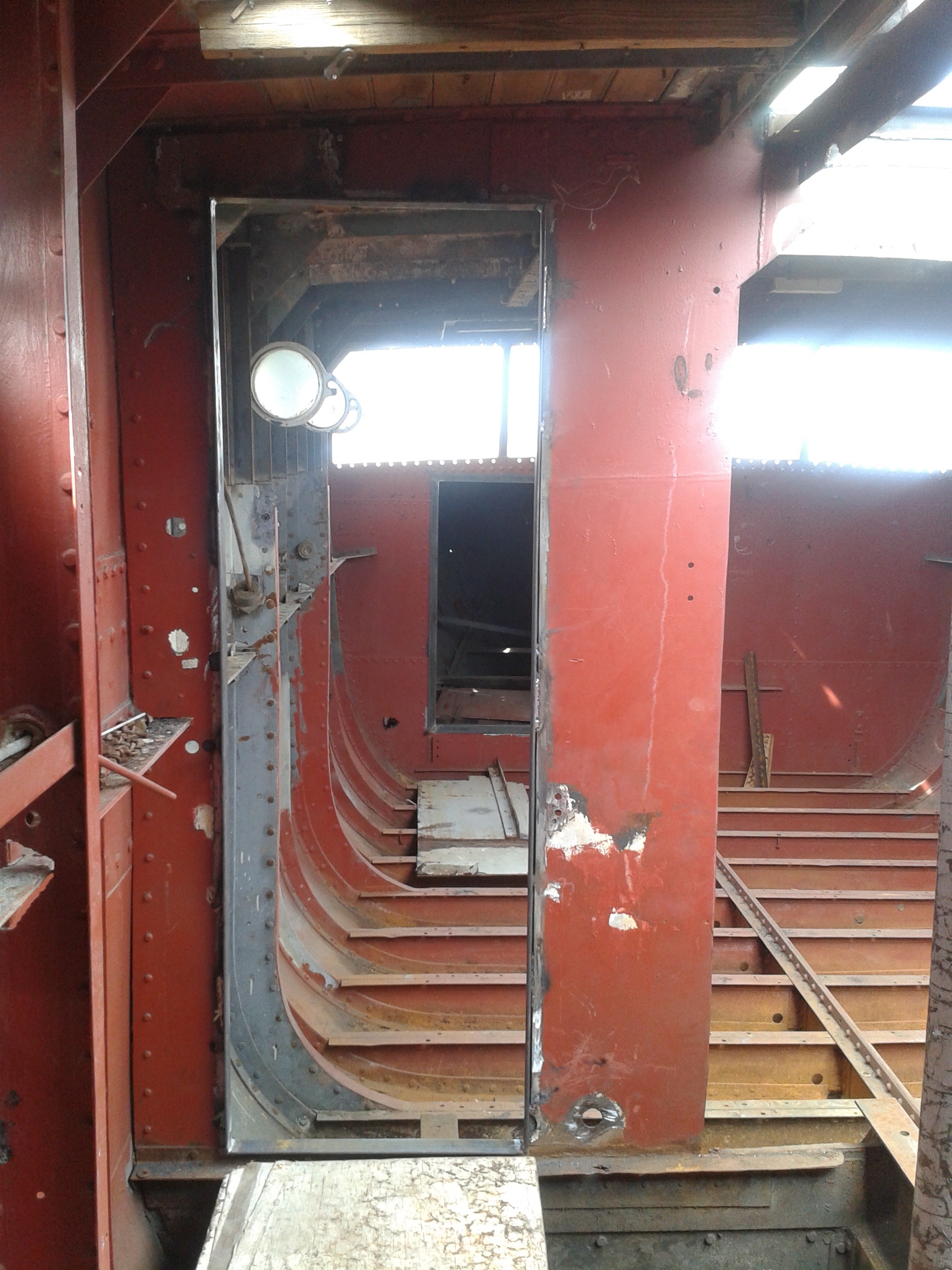 Literally. But this time the welders haven’t been welding but rather cutting away. Specifically through from the rear cabin into the engine room, the engine room to the main cabin, and the main cabin to the front cabin. The new openings have been framed like doorways and the space is really starting to make sense.