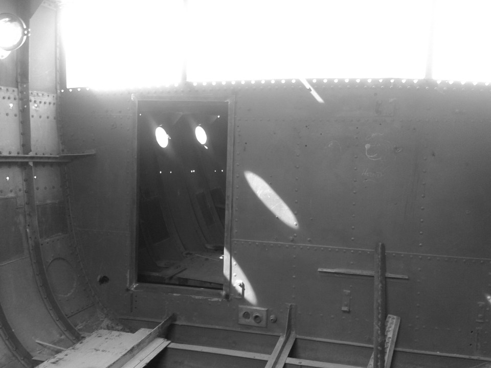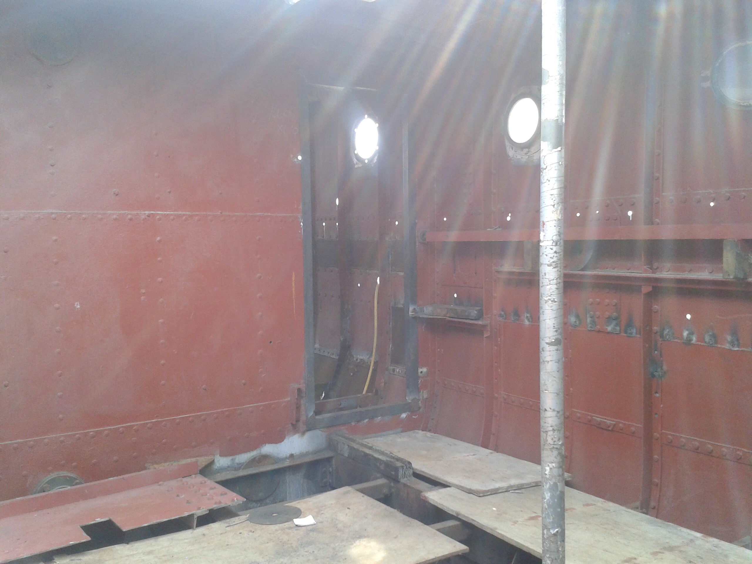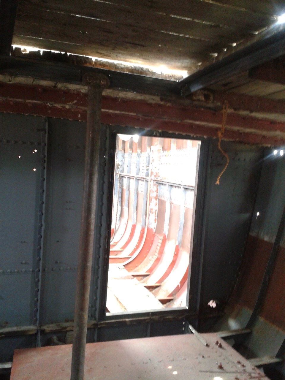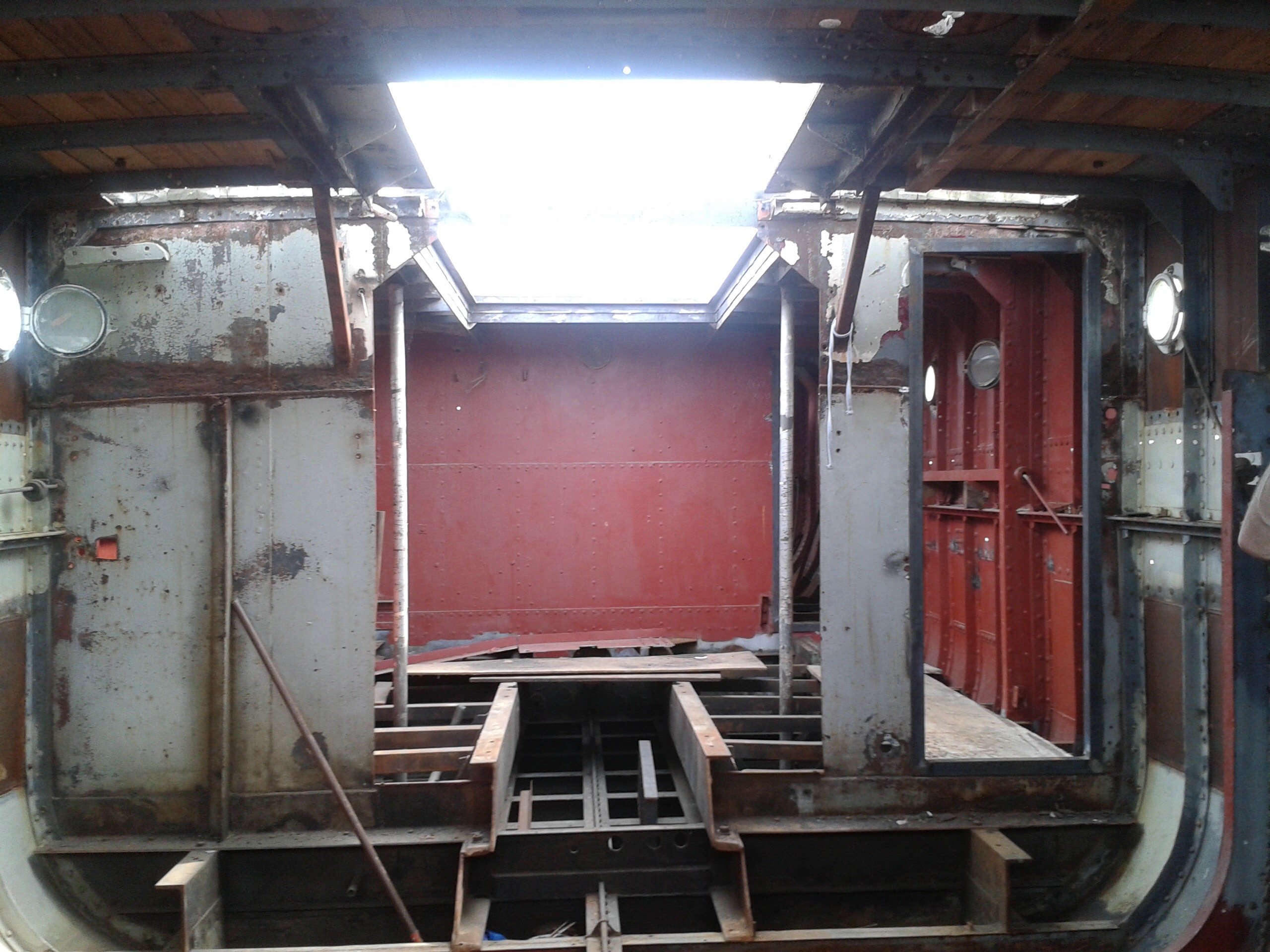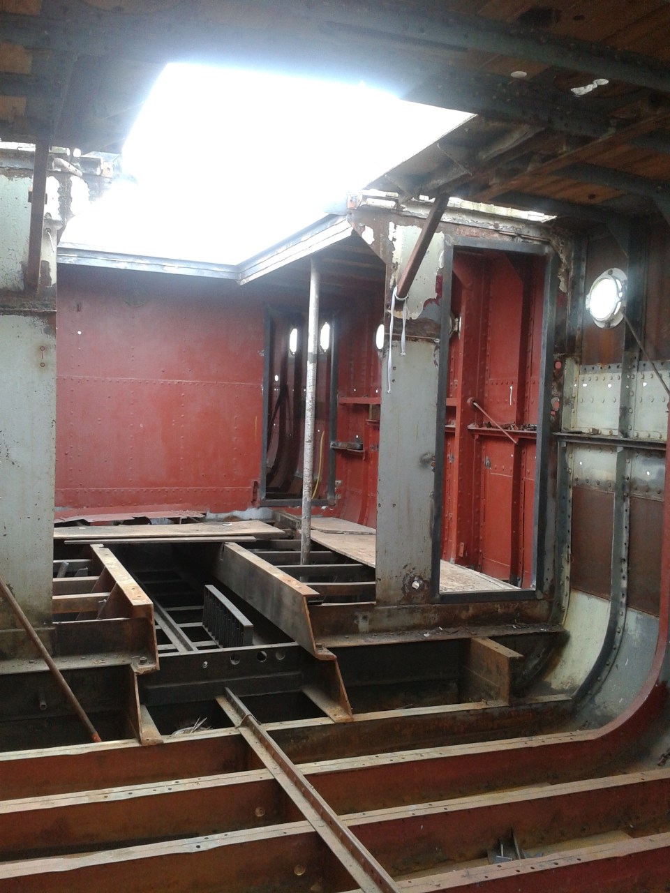 The view back into the engine room showing the corridor down the side and the newly framed hatch on the deck.