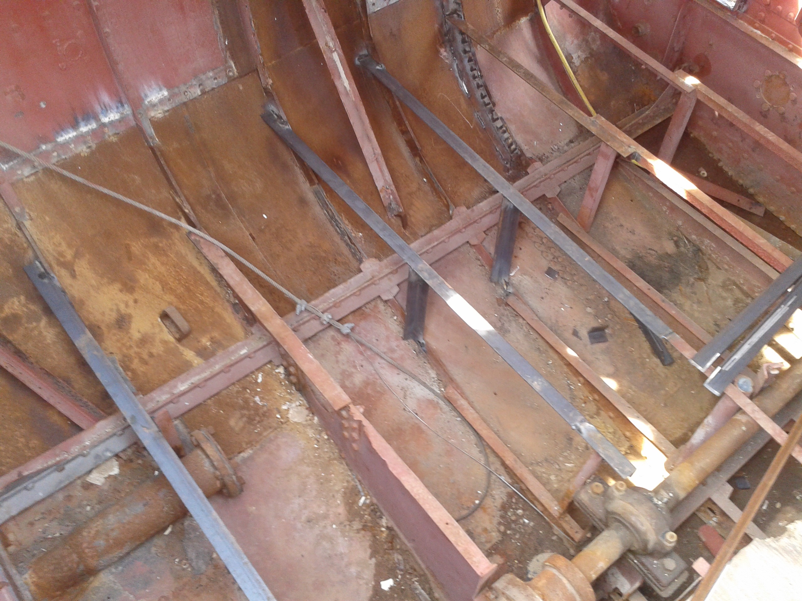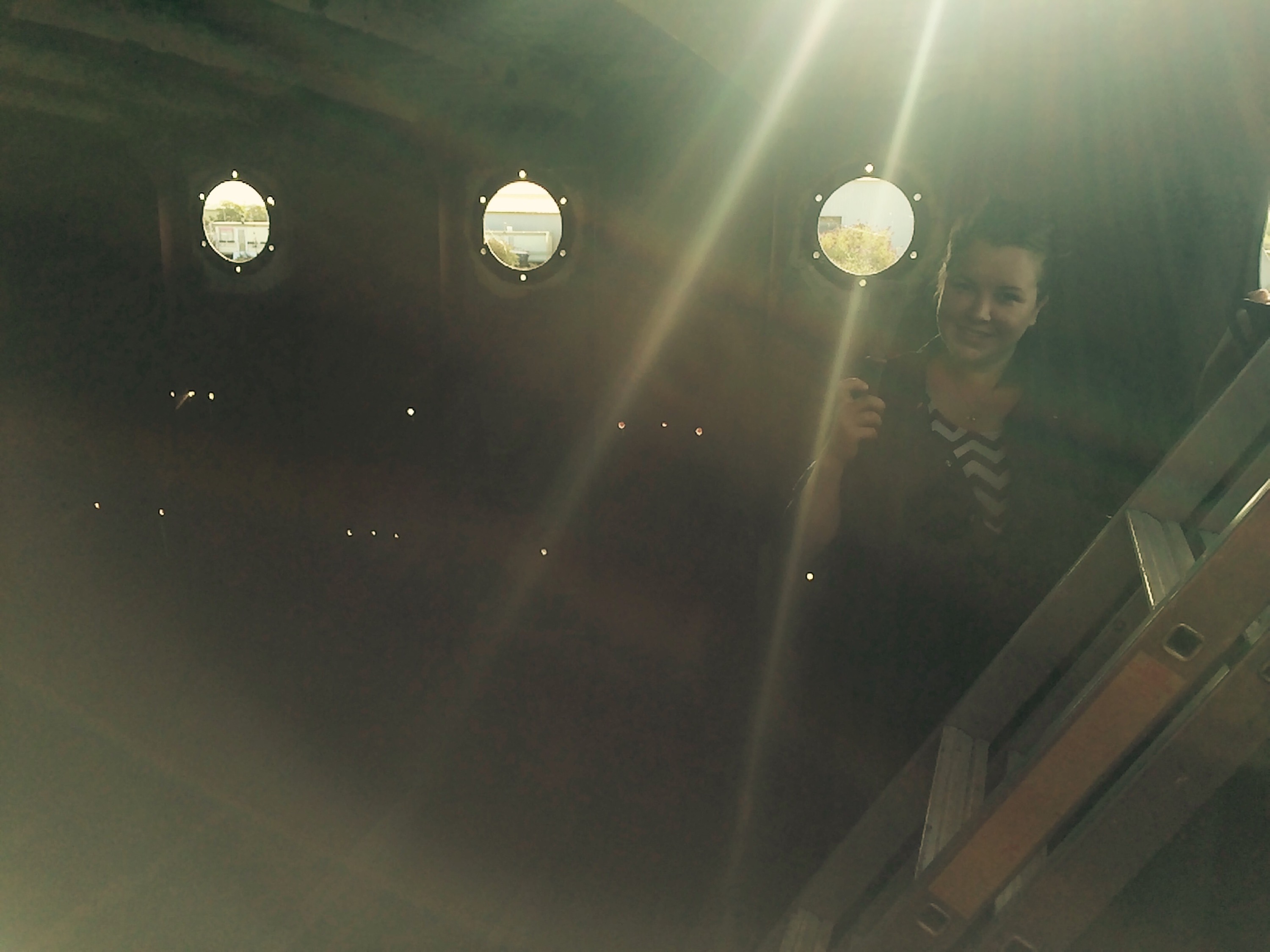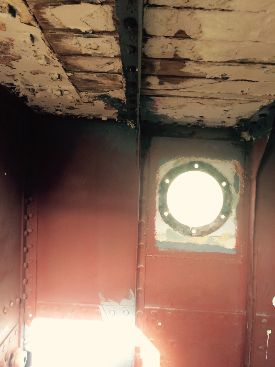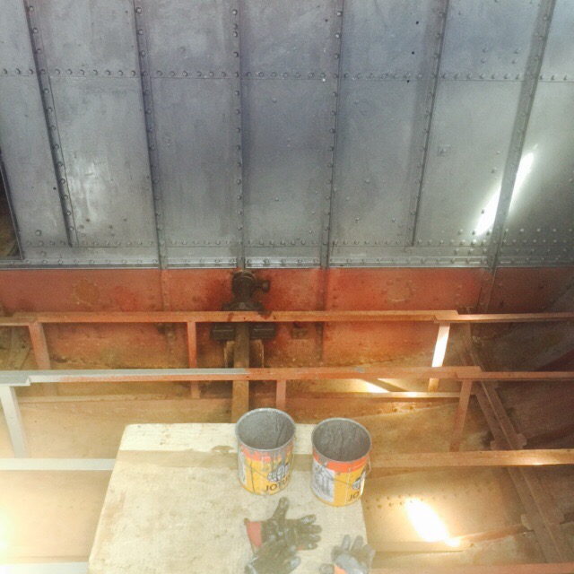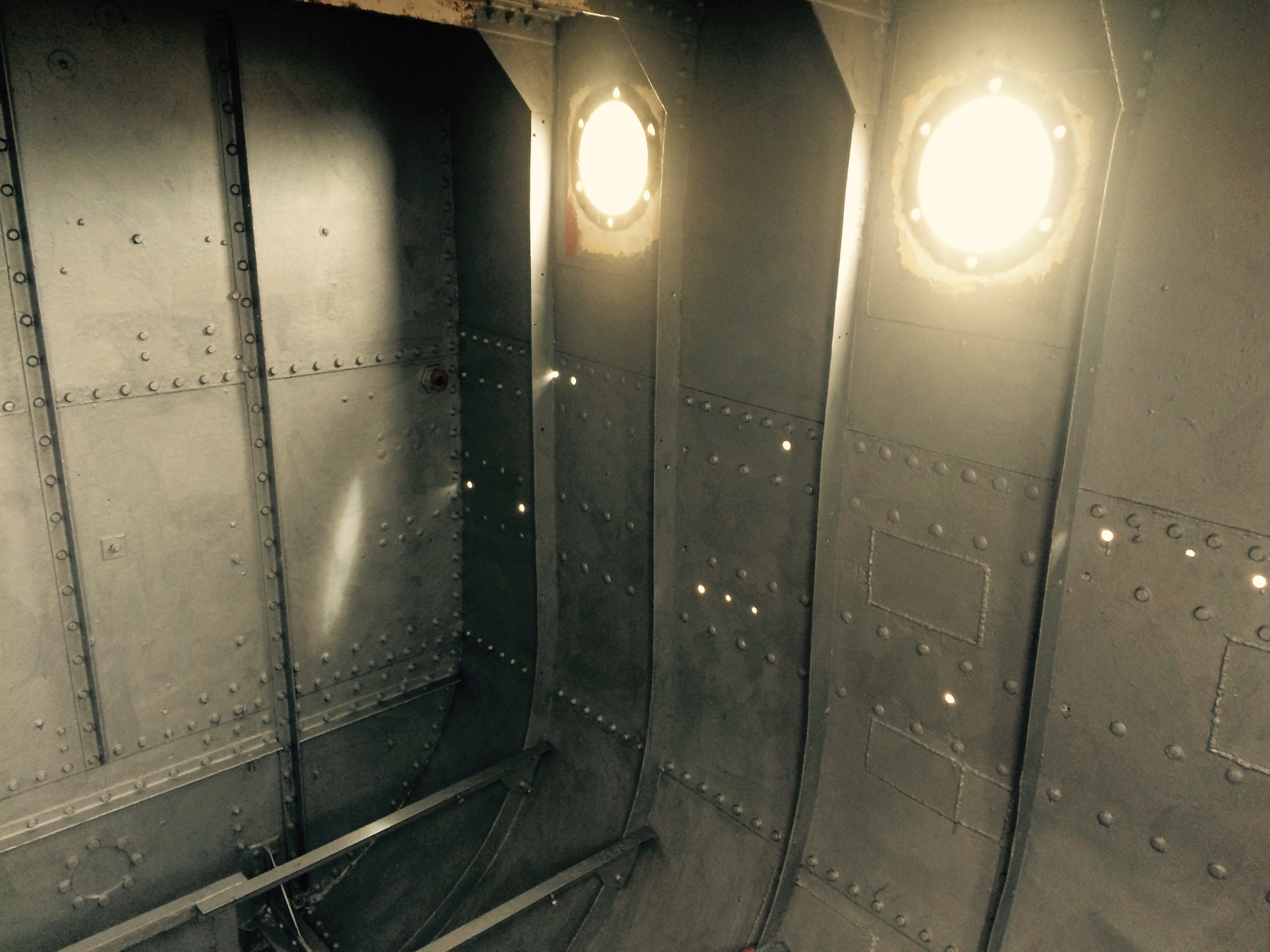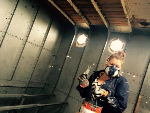 Finally slapping some paint on the old girl. A supremely difficult task given the angles, the structure built inside the bilge, and the sheer number of rivets to paint. The paint itself smells noxious and sticky and to get from section to section you have to climb over or through hurdle height structures. Tough stuff.
