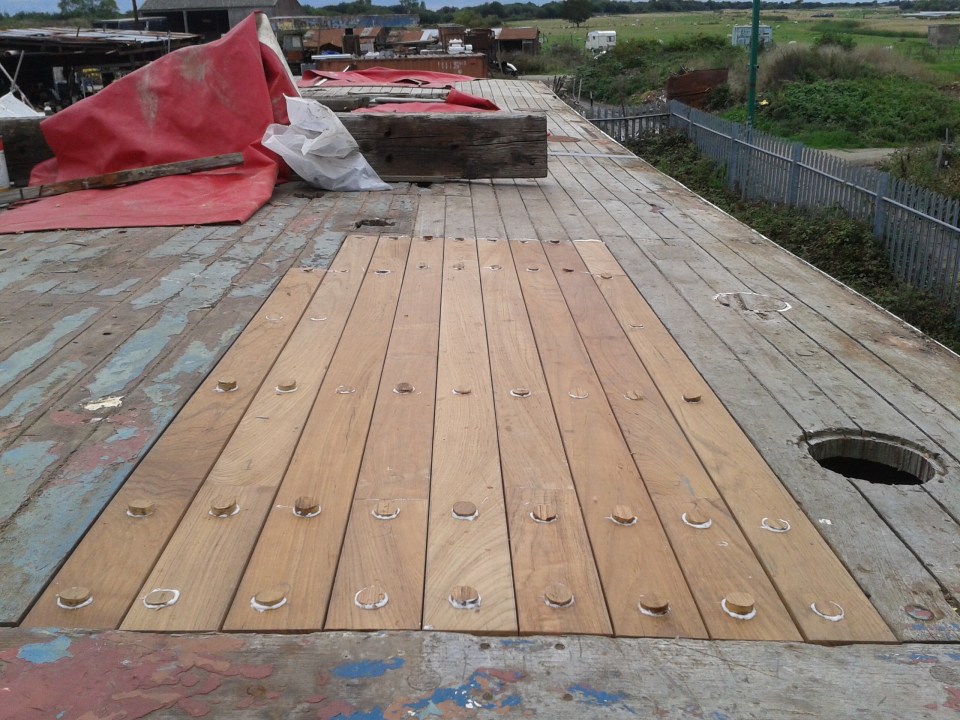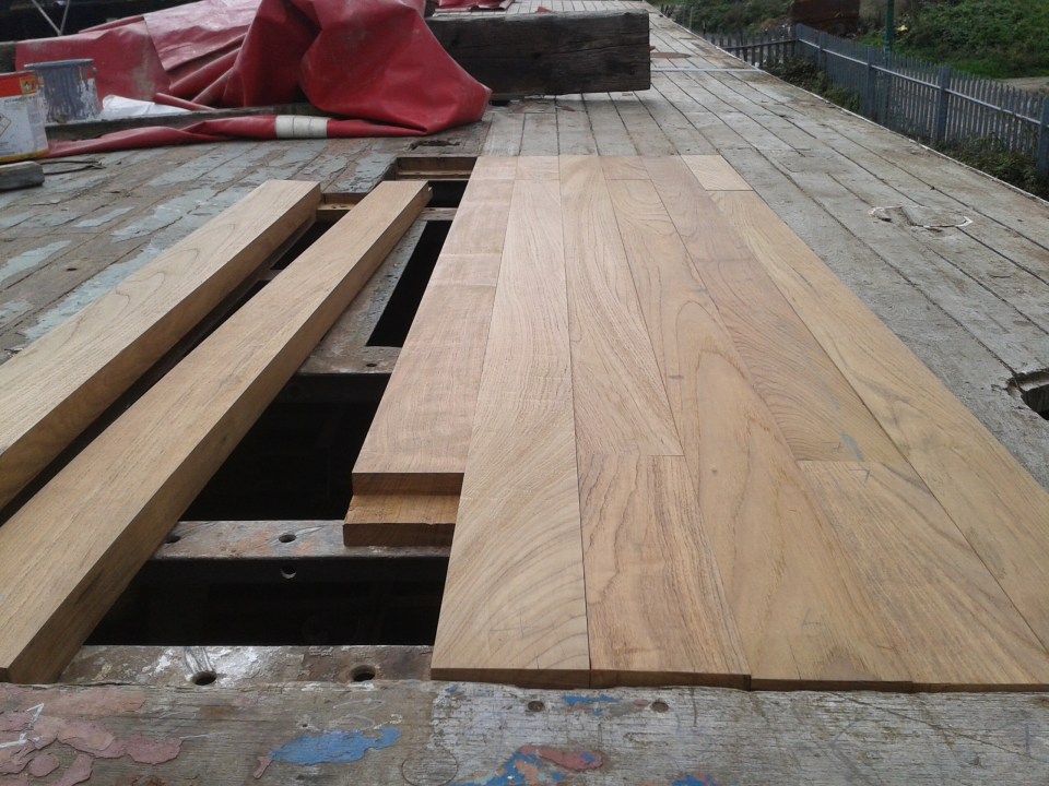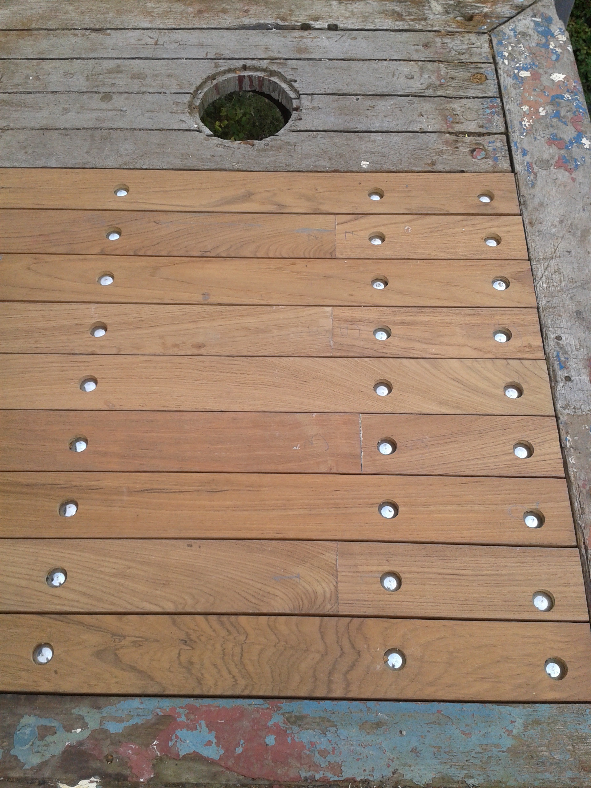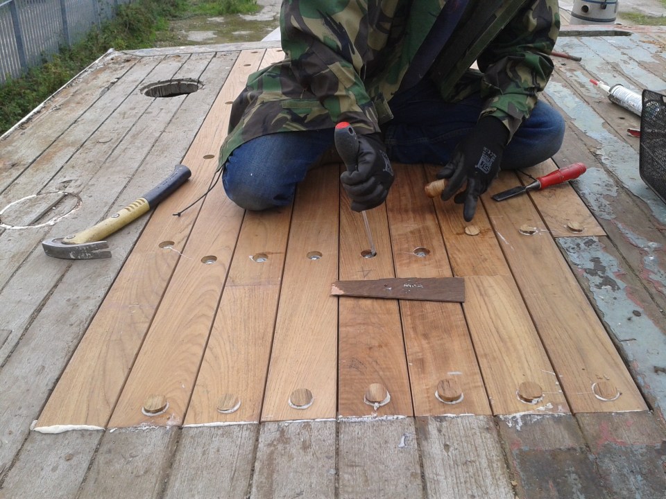 Then work has started patching up the desk. The main area that needed attention was on the upper deck where there used to be a hatch. The old rotten bits of non-teak were removed and replaced with brand new bits.