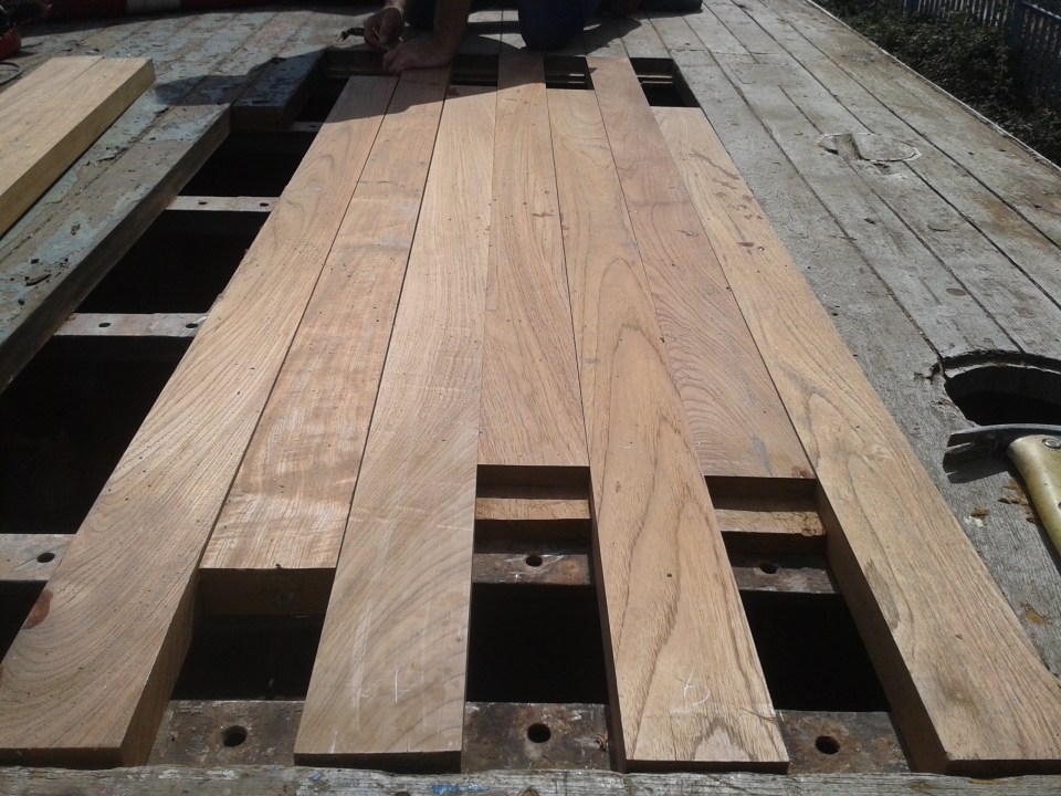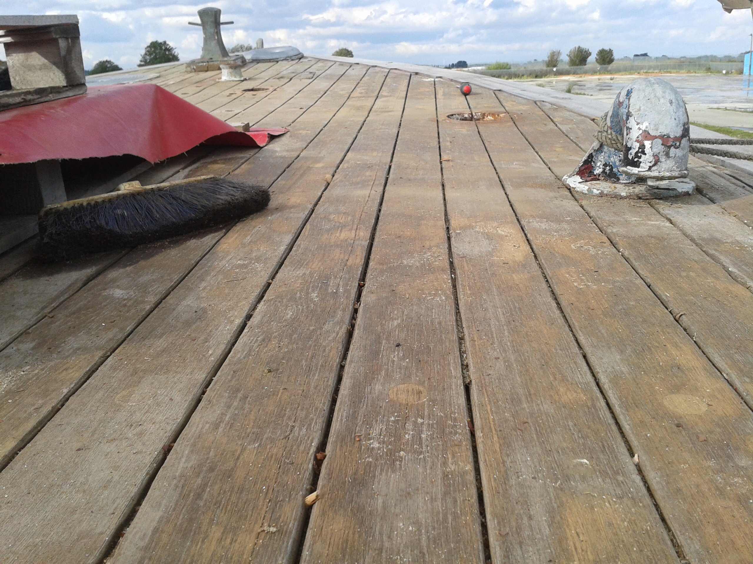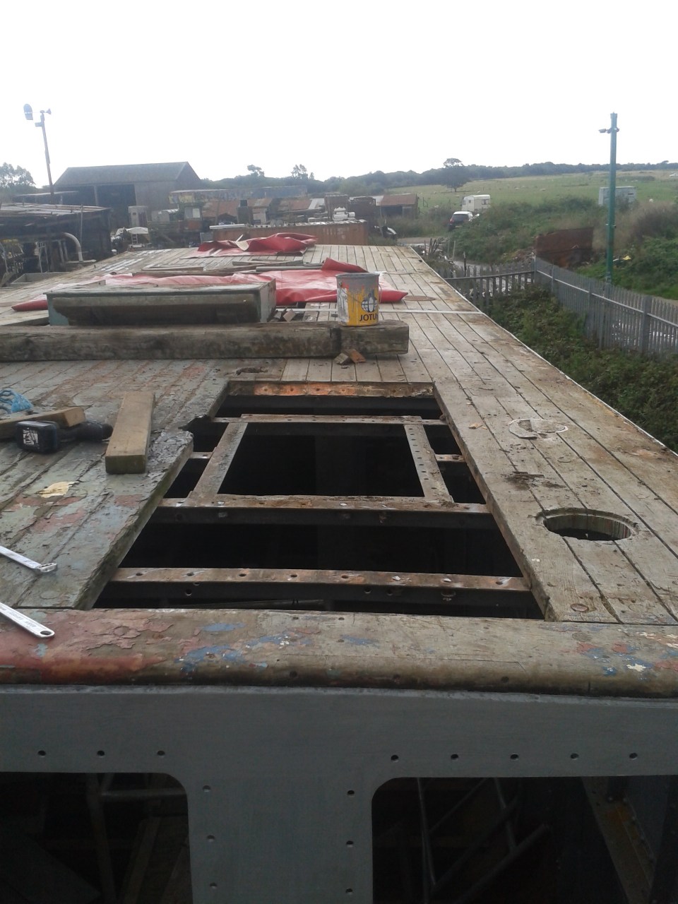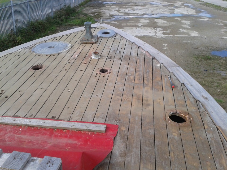 I forgot I had these pictures of the deck work in progress. This shows the deck stripped of all furnishings, the wood being cut for size for the hatch, and the light sand that has been done so far. This has knocked off some of the paint but more elbow grease will be required to get the final remnants off.