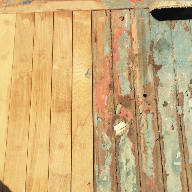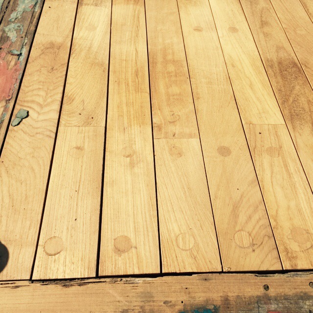 I am in danger of becoming a deck bore. But it is looking pretty darn lovely. Here is a view across the patched hatch. It also shows the different qualities of the deck – the new wood, the aged wood, and the really dodgy paint covered bit.