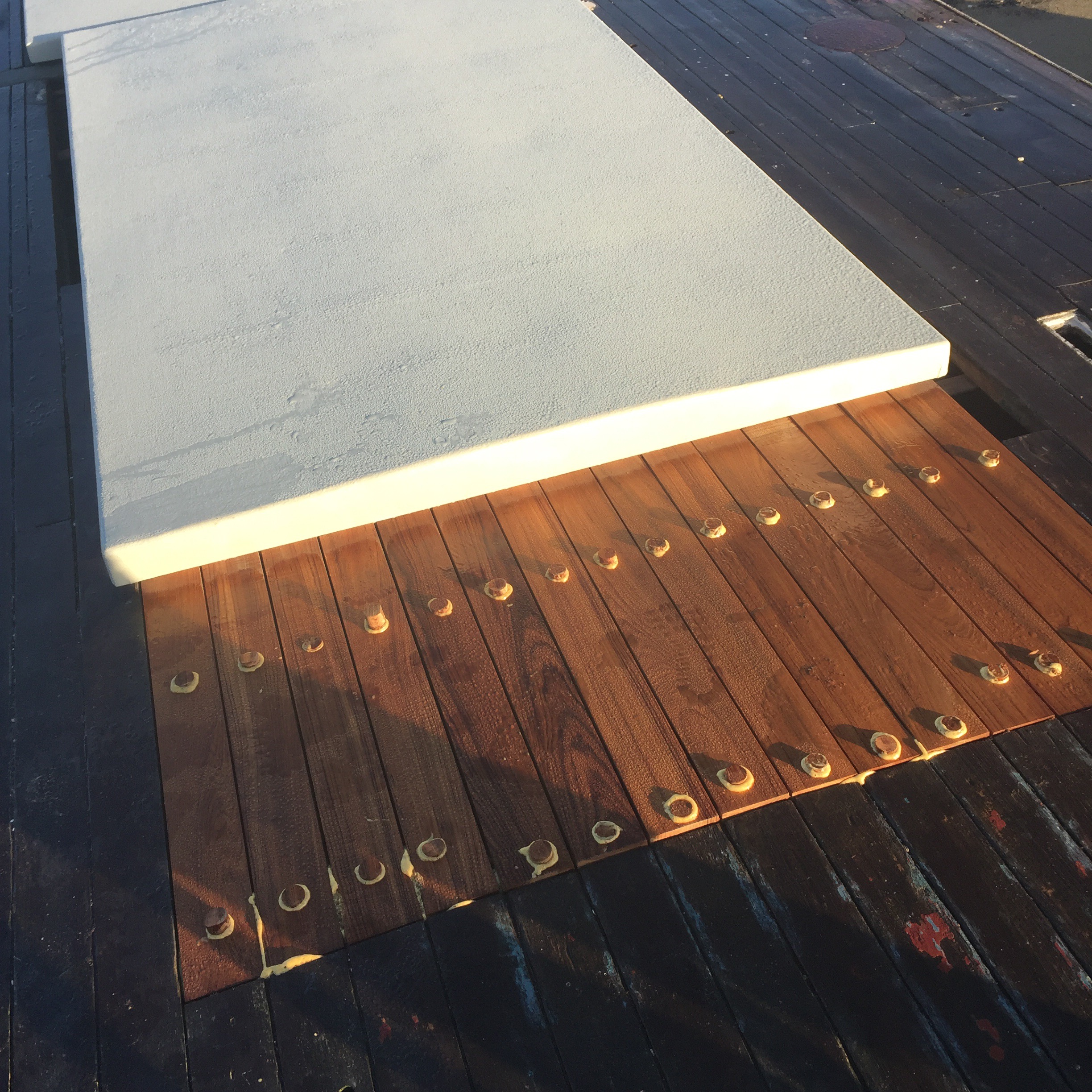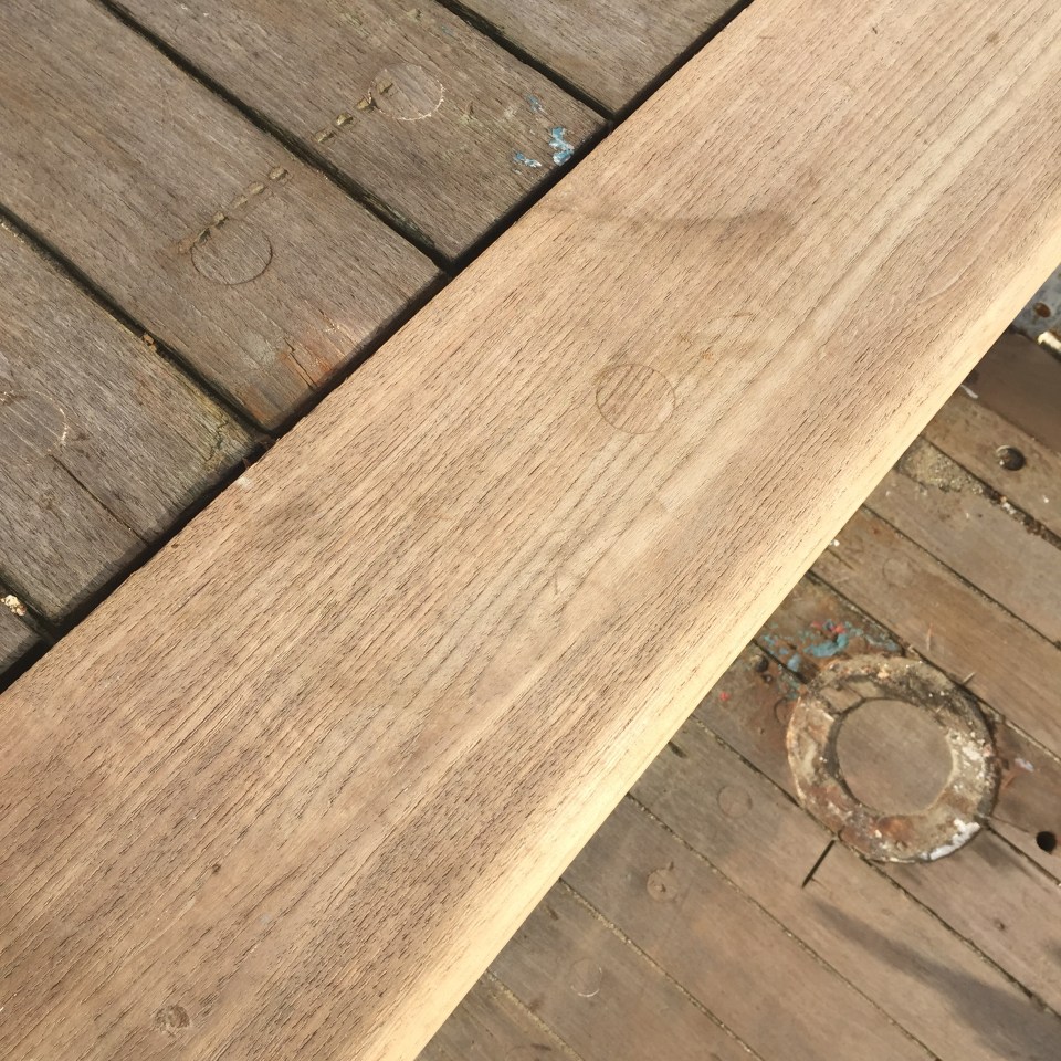 The margin planks on the foredeck were a bit wobbly (a whole other story) so these were rebedded and reattached. They had originally been fitted with a square edge and without the overhang that is meant to ensure the water runs off over the side of the boat. This was fixed through attaching a bullnose trim which provided the overhang and neatened it all up.