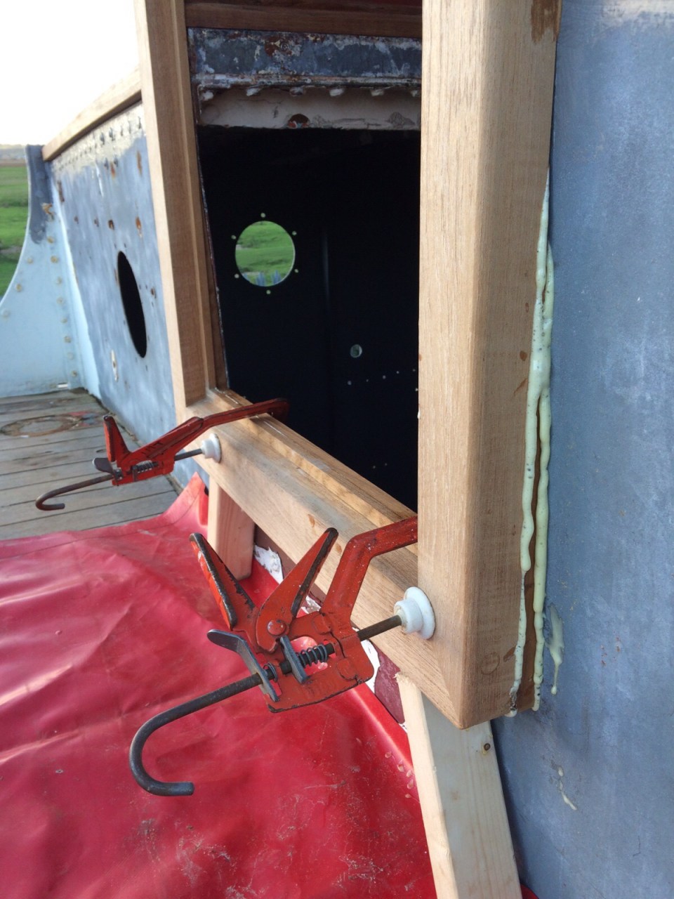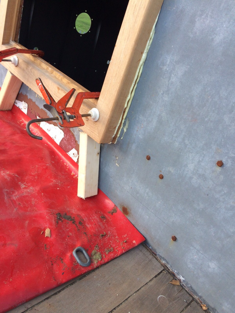 Next the temporary door on the hatch. This has been ingeniously mcgivered into place to avoid drilling into the frame.