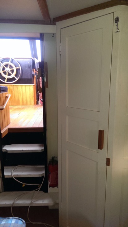 Well doesn’t this look like the smartest bedroom afloat? A platform for the bed, step up and inbuilt storage to the sides. Well done Ian!!